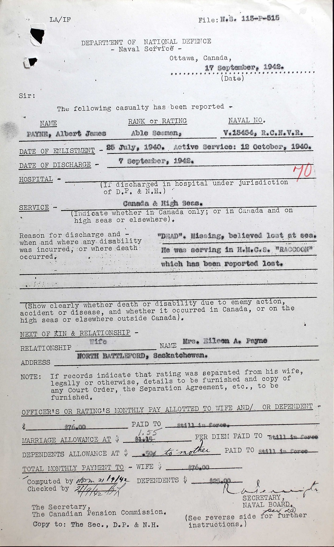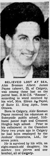 PAYNE, Albert James, AB, V13454, RCNVR, MPK - 07 Sep 1942, HMCS RACCOON - son of Stephen Payne, and of Louisa Payne; husband of Eileen Ann Payne; all of Calgary, AB.