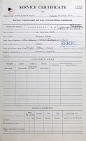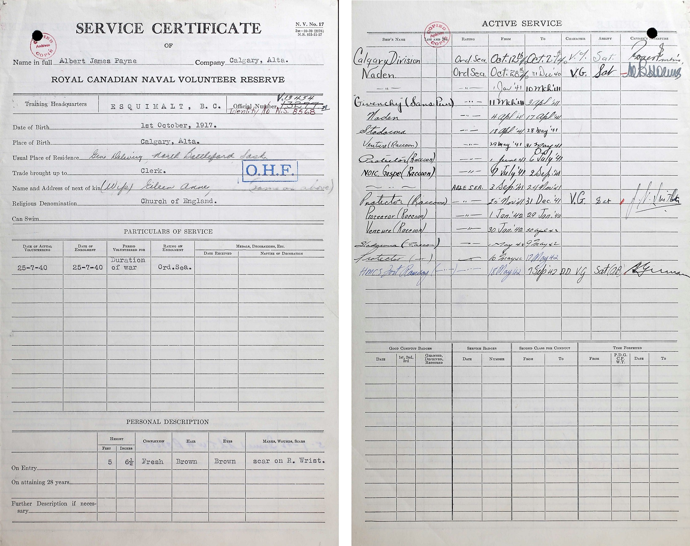 Ships served in: CALGARY DIVISION RCNVR - Enlisted 25 Jul 1940. Commenced Active Service 12 Oct 1940 HMCS NADEN - Drafted to NADEN 28 Oct 1940 as an OS, RCNVR HMCS SANS PEUR - Drafted to SANS PEUR 11 Mar 1941 as an OS, RCNVR HMCS NADEN - Drafted to NADEN 04 Apr 1941 as an OS, RCNVR HMCS STADACONA - Drafted to STADACONA 18 Apr 1941 as an OS, RCNVR HMCS RACCOON - Drafted to RACCOON 29 May 1941 as an OS, RCNVR * Rated AB 03 Sep 1941
