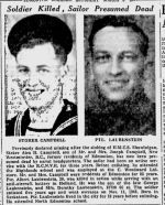 Before enlisting he attended the Highlands school and was employed at the C. Woodward Ltd. store. His parents were residents of Edmonton for 23 years.