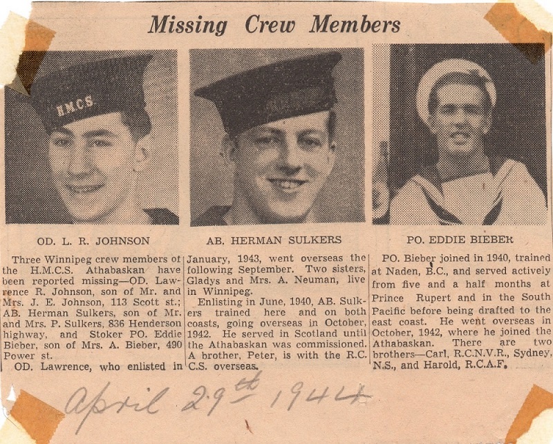 BIEBER, Edgar Edward (Eddie), Sto PO, V9844, RCNVR, MPK - 29 Apr 1944, HMCS ATHABASKAN - Son of Andrew Phillip and of Caroline Bieber, of Winnipeg, MB.