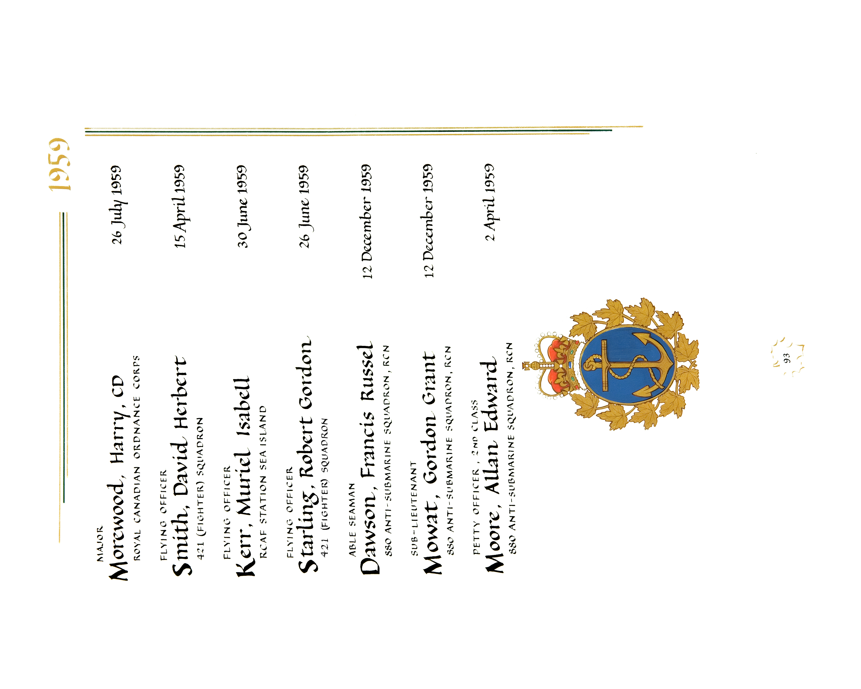MOWAT, Gordon Grant, SLt, O-53878, RCN, died - 12 Dec 1959, 880 Anti-Submarine Squadron - Son of Leslie and Mary Mowat of Montreal, QC. Brother of Yvonne Wales. He enlisted in the RCN 03 Jan 1952, Halifax, NS.