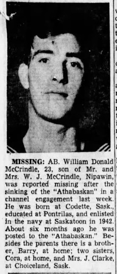 MISSING: AB William Donald McCrindle, 23, son of Mr. and Mrs. W.J. McCrindle, Nipawin, was reported missing after the sinking of the Athabaskan in a channel engagement last week. He was born at Codette, Sask., educated at Pontrilas, and enlisted in the navy at Saskatoon in 1942. About six months ago he was posted to the Athabaskan. Besides the parents there is a brother, Barry, at home; two sisters, Cora, at home, and Mrs. J. Clarke, at Choiceland, Sask. (The Regina Leader-Post 08 May 1944)