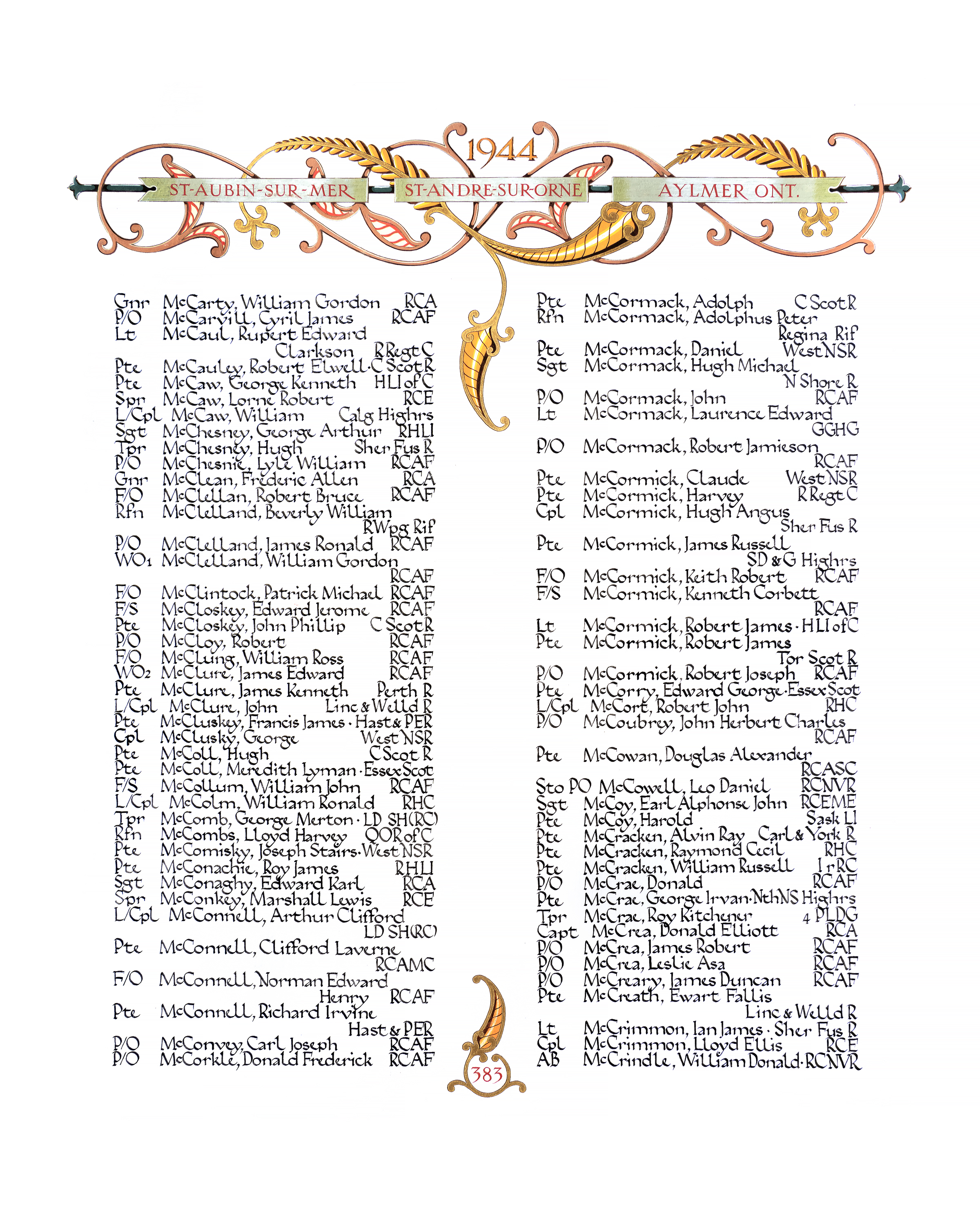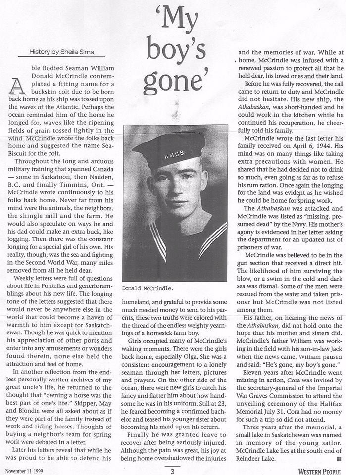 MCCRINDLE, William Donald, AB, V1854, RCNVR, MPK - 29 Apr 1944, HMCS ATHABASKAN - son of William James McCrindle and Cora Evelyn McCrindle, of Nipawin, SK. The province of Saskatchewan honoured Able Seaman McCrindle by naming McCrindle Lake in his honour.