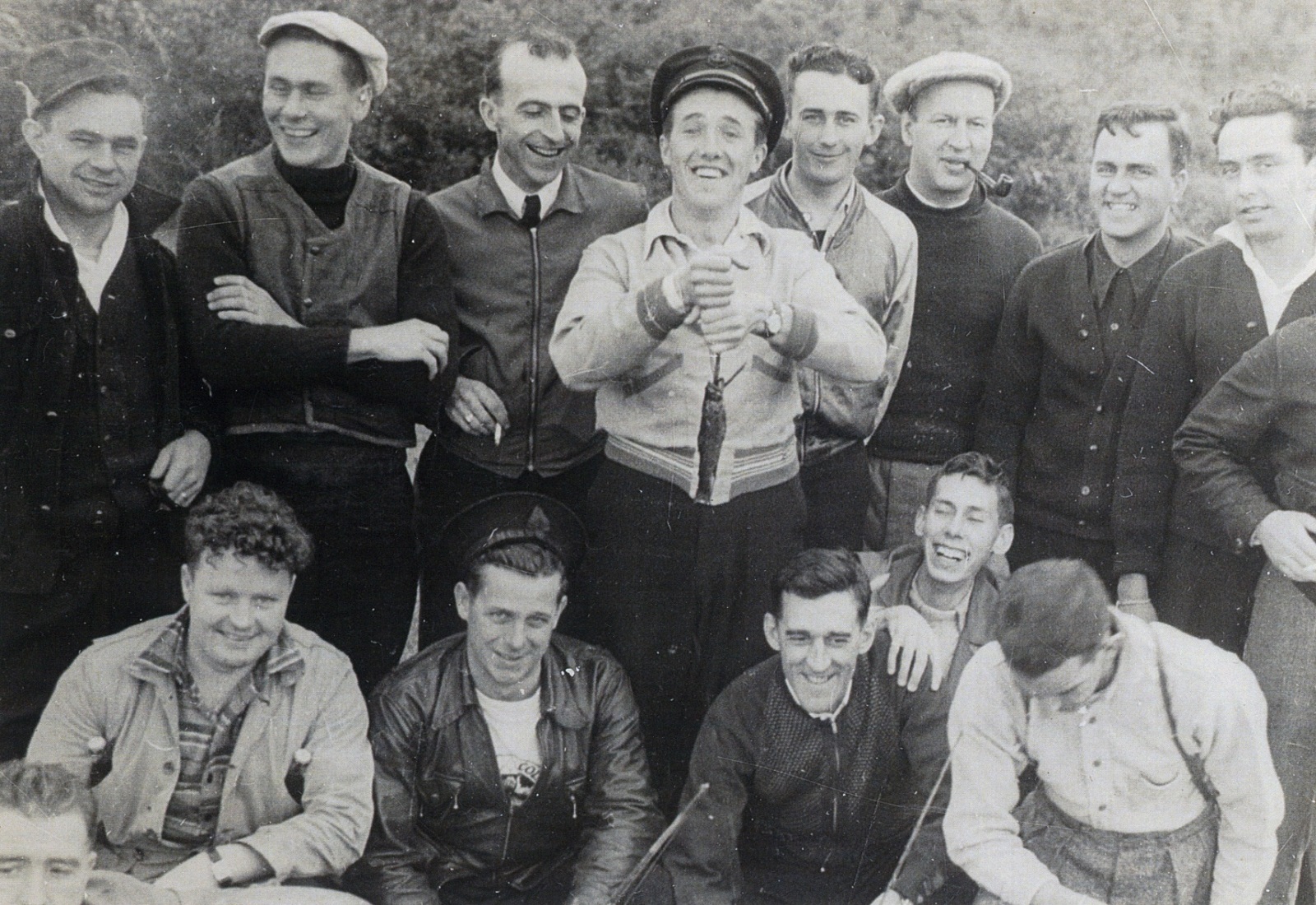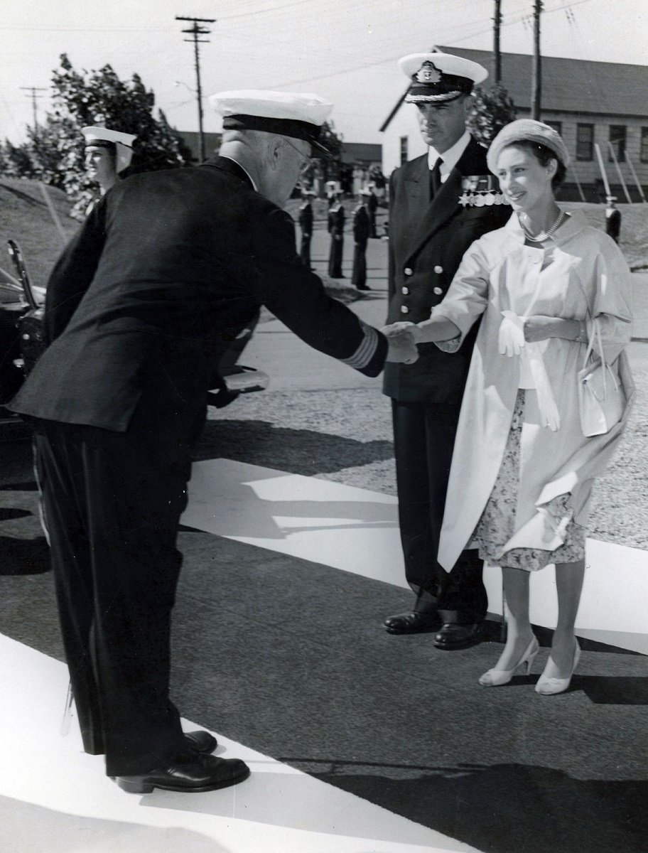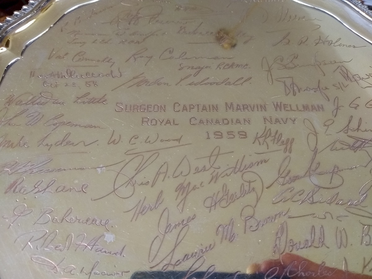 (1) A fishing trip in Newfoundland - 1944. Surg-Cdr Wellman, back row with pipe. (2) Surgeon Captain Marvin Wellman and Mrs. Mary Gibson Fletcher Wellman (3) Surg-Capt Wellman greets Princess Margaret at HMCS Cornwallis during her official visit to Nova Scotia in 1958 (4) Silver platter presented to Surg-Capt Wellman on his retirement from the Navy in 1959