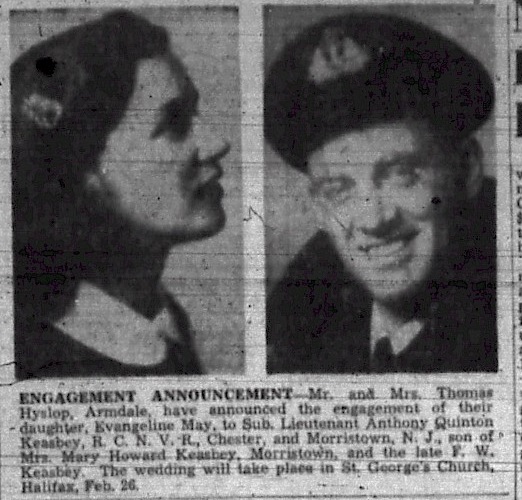 Engagement announcement of SLt Anthony Keasbey to Evangeline May Hyslop The Halifax Herald 22 Feb 1944 Researched by George Newbury