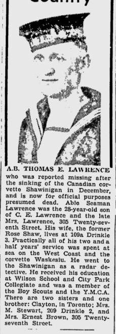 LAWRENCE, Thomas Edward, AB, V37688, RCNVR, MPK - 24 Nov 1944, HMCS SHAWINIGAN - Son of Mr. and Mrs. Charles Ernest Lawrence; husband of Rose J. Lawrence, all of Saskatoon, SK.