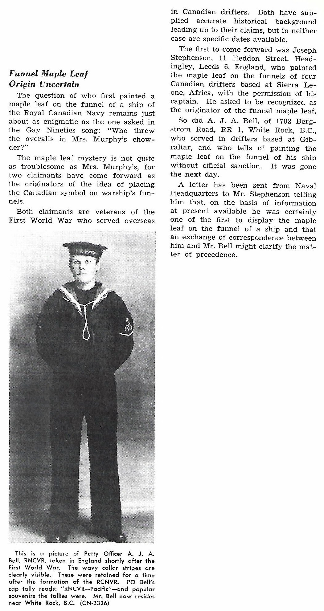PO Arthur Bell is one of two sailors who are believed to be the first sailors to have painted a maple leaf on the funnel of a Canadian warship.