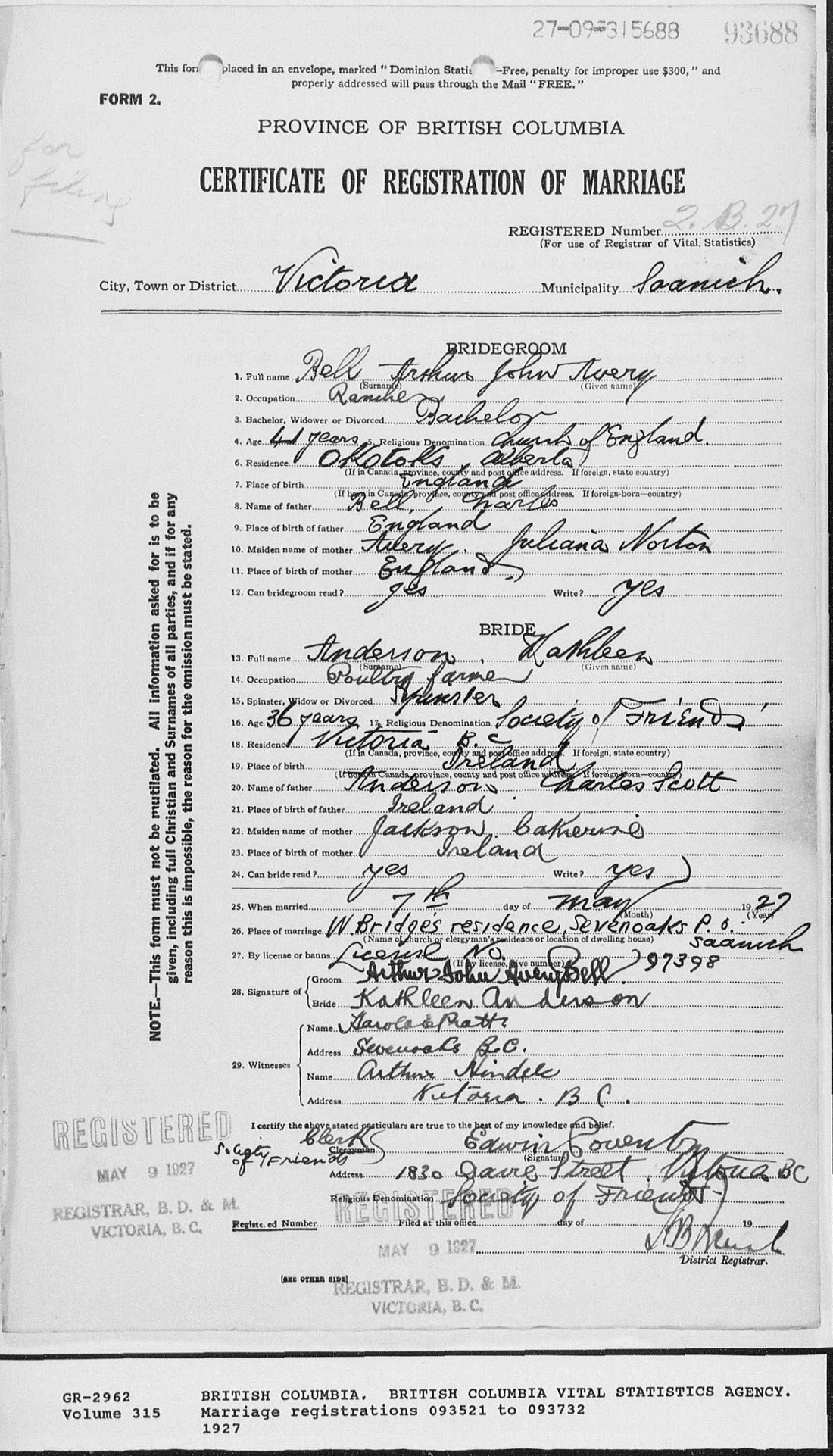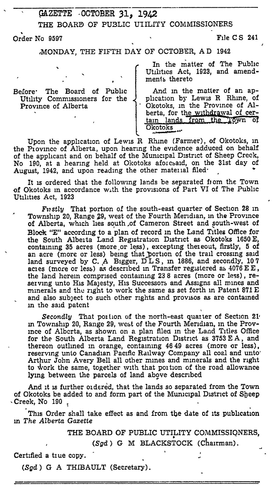 At the time of his marriage Arthur resided in Okotoks, Alberta.