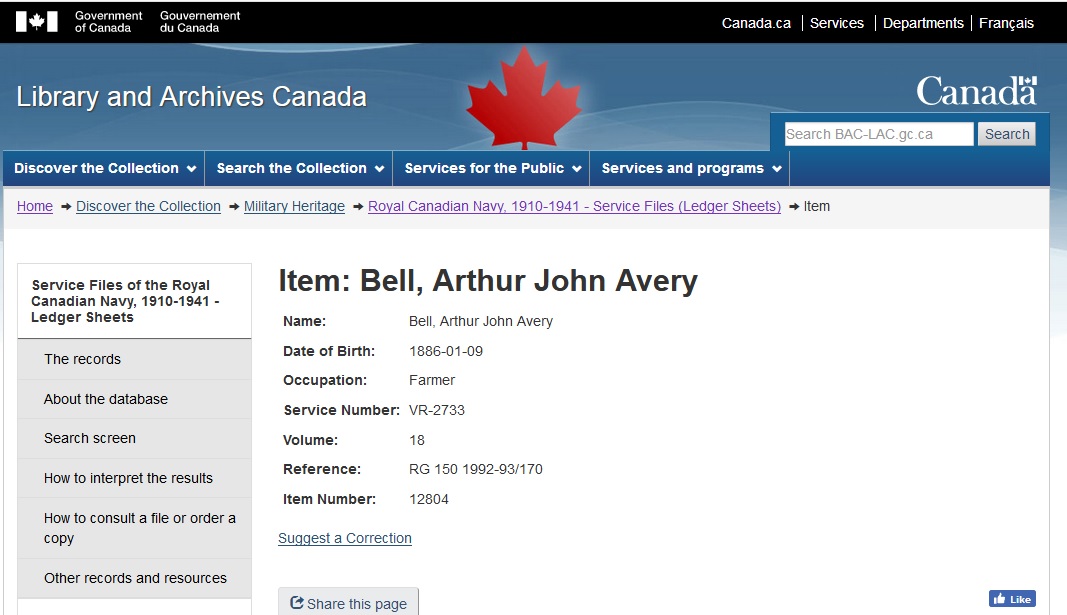 (1) Newspaper article from the Crowsnest, Vol.10 No.2. Dec.1957, Pg.3 - on who painted the first maple leaf on a Canadian warship (2) Marriage Certificate for Arthur Bell (3) Okotoks Gazette Order 31 Oct 1942 showing Arthur Bell owned land in / near Okotoks, AB (4) Death Certificate for Arthur Bell (5) Screen capture from the Library and Archives of Canada - RCN Ledgers page for Arthur Bell