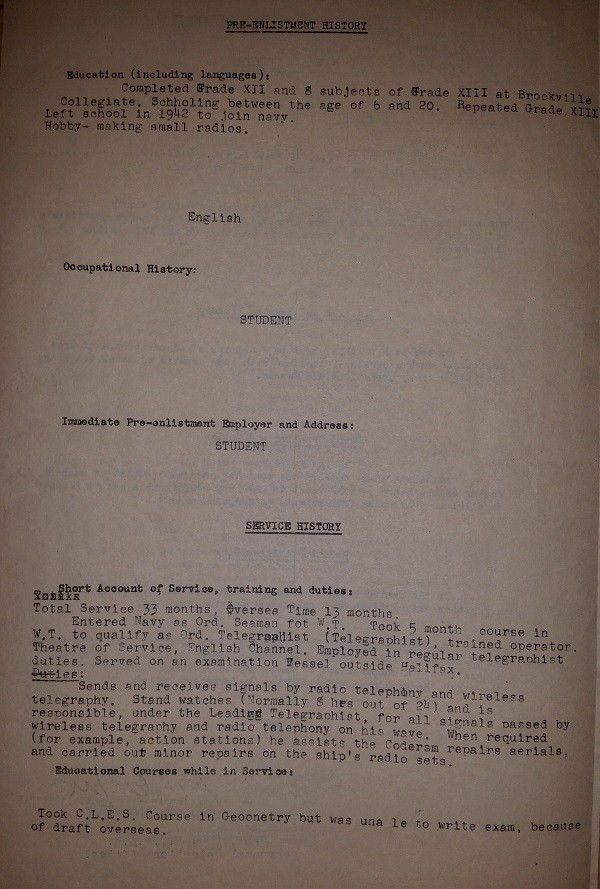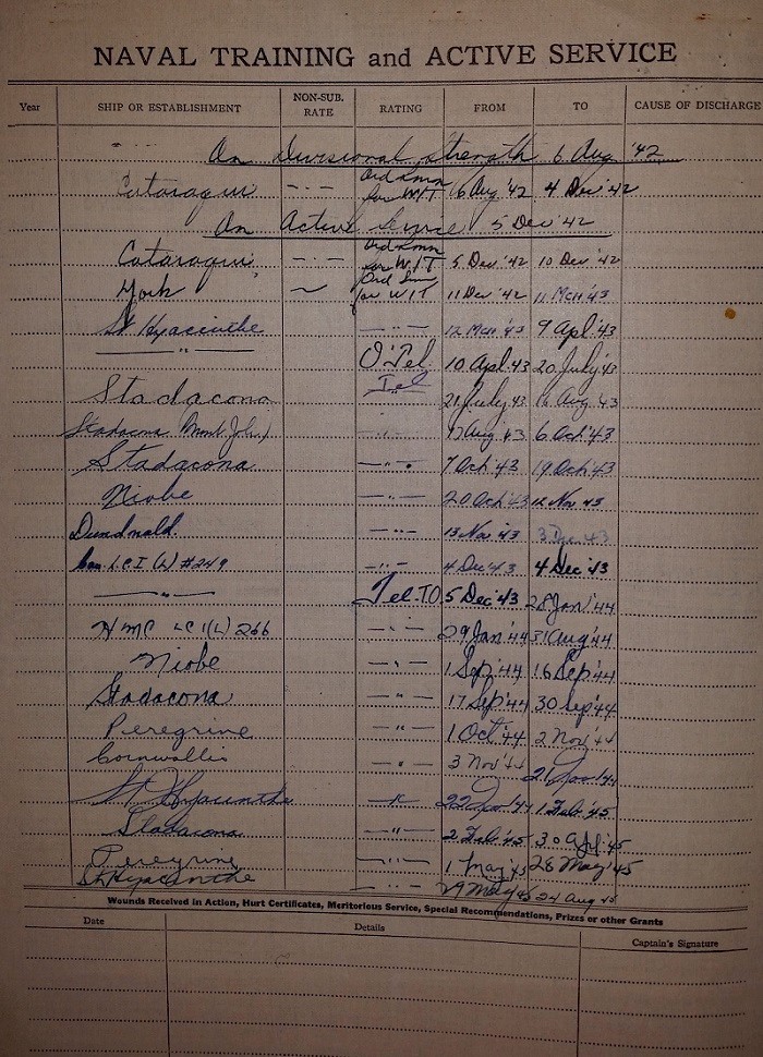 Ships served in: HMCS CATARAQUI HMCS MOUNT JOLI - Served in Mont Joli 17 Aug 1943 - 06 Oct 1943 as a Tel, RCNVR LCI(L) 249 - Served in LCI(L) 249 04 Dec 1943 - 28 Jan 1944 as a Tel (T.O.), RCNVR LCI(L) 266 - Served in LCI(L) 266 29 Jan 1944 - 31 Aug 1944 as a Tel (T.O.), RCNVR
