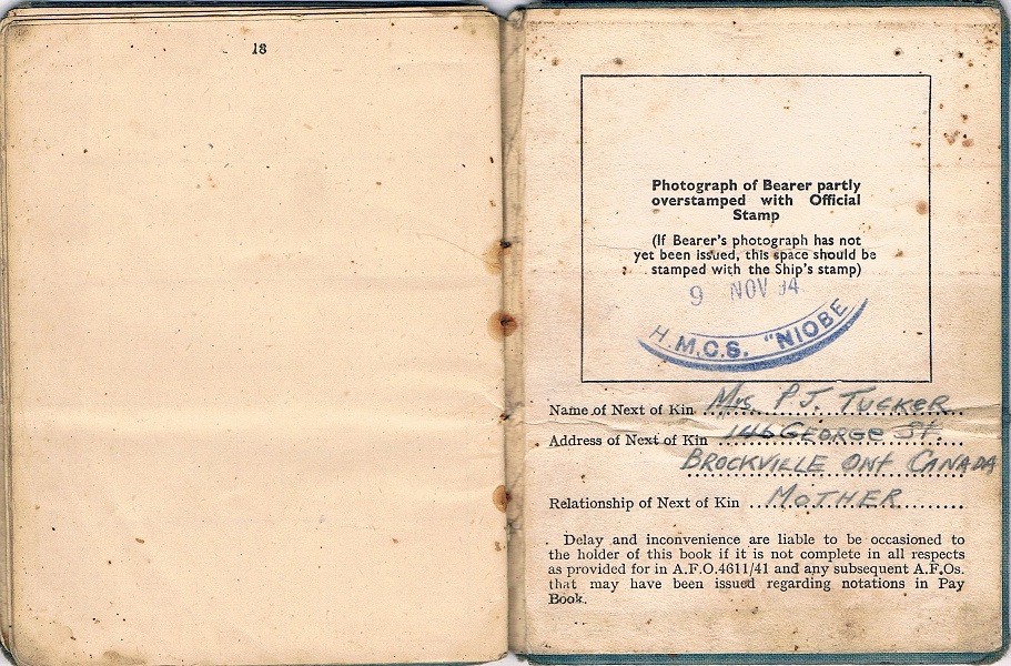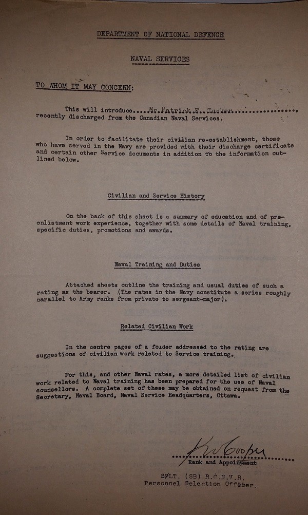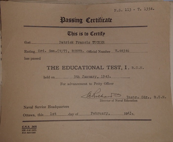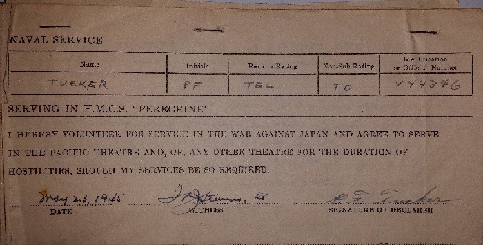 (1) Frank Tucker (2) Certificate of Service (3) Naval Training and Active Service record (4) Document showing that Frank Tucker volunteered for service in the Pacific for the duration of hostilities, 23 May 1945 (5) Patrick Francis Tucker, Passing Certificate, Educational Test 1, RCN, 05 Jan 1943 (6) Letter from DND Naval Service indicating documentation provided to Frank Tucker on release to assist in transition to civilian life. (7) Pre-Enlistment History and Service History (8) Letter directing Patrick Francis Tucker to report for active service