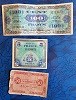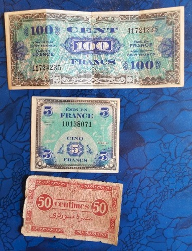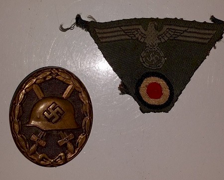 (40-41) War souvenirs of Frank Tucker (40) The badge on the left is given to soldiers or their families for being wounded or killed in battle. The badge on the right is a German Army cloth cap badge. (41) French currency