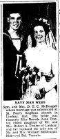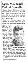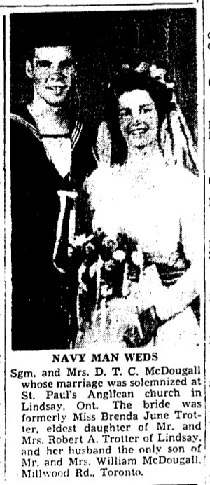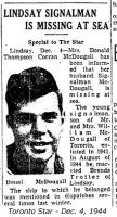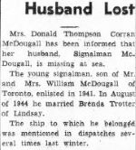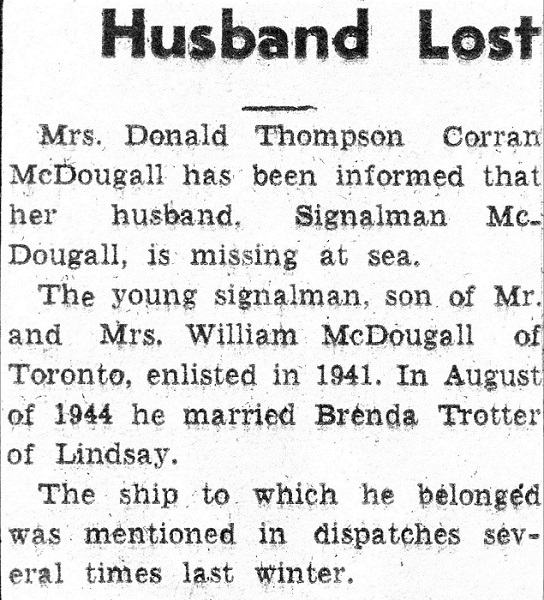 (DM01) Wedding Announcement for Donald and Brenda McDougall - The Toronto Star Sep 1944 (DM02) Mrs. Brenda McDougall informed her husband is missing at sea (DM03) Lindsay Signalman is missing at sea (DM04) Signalman McDougall on Lost Corvette (DM05) Documents from the Service File of Donald McDougall