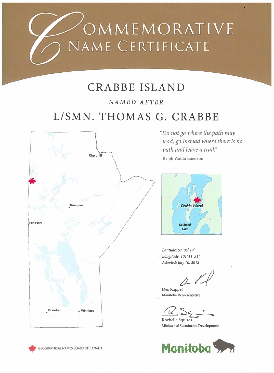 Crabbe Island, Manitoba was named after Leading Seaman Crabbe on 10 Jul 2018. Crabbe Island is located in Goldsand Lake at 57° 06’ 19” latitude and 101° 11’ 31” longitude approximately 30km north of north of Lynn Lake.