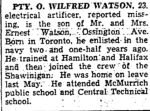 Electrical Artificer Wilfred Watson, 23, is the son of Mr. and Mrs. Ernest Watson, Ossington Ave. Born here, he attended McMurrich School and enlisted 2½ years ago after having previously been to sea, traveling between Canada, Bermuda and New York. Before joining the Shawinigan, he trained at Hamilton and Halifax. (Newspaper clipping, the Globe and Mail, Friday, Dec. 8, 1944)