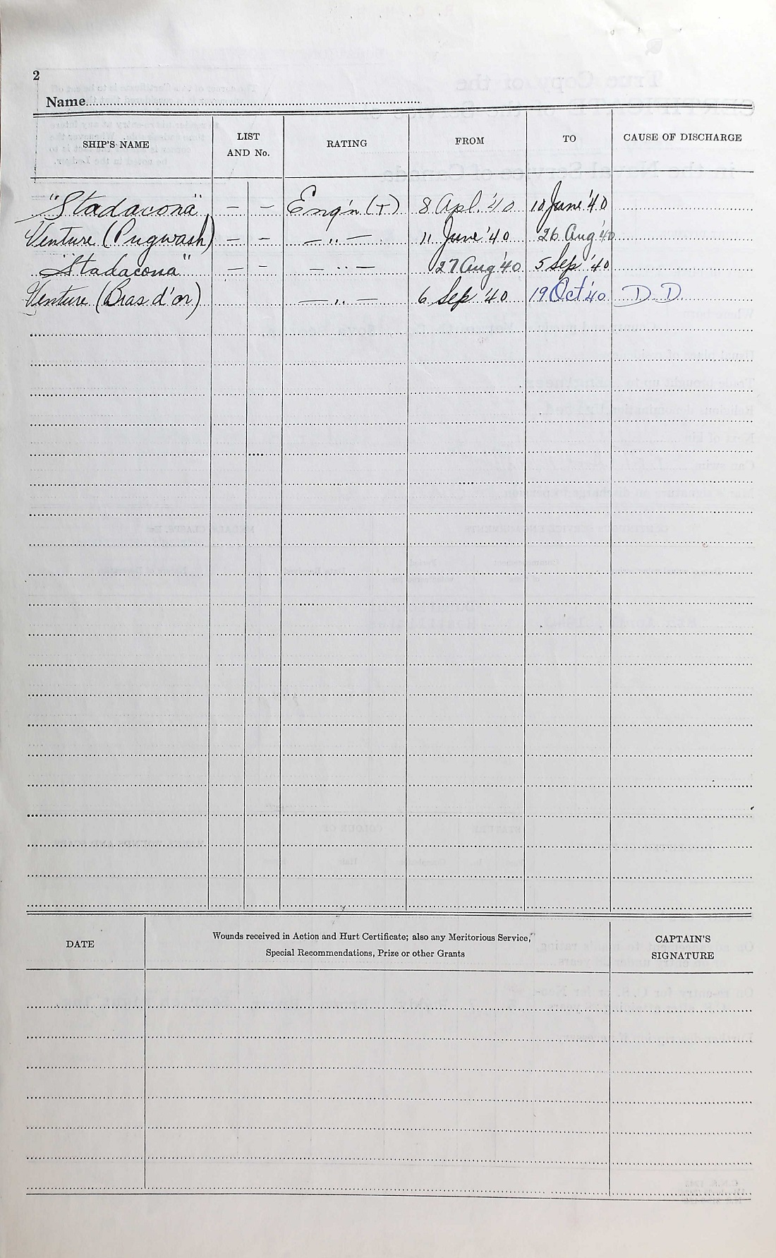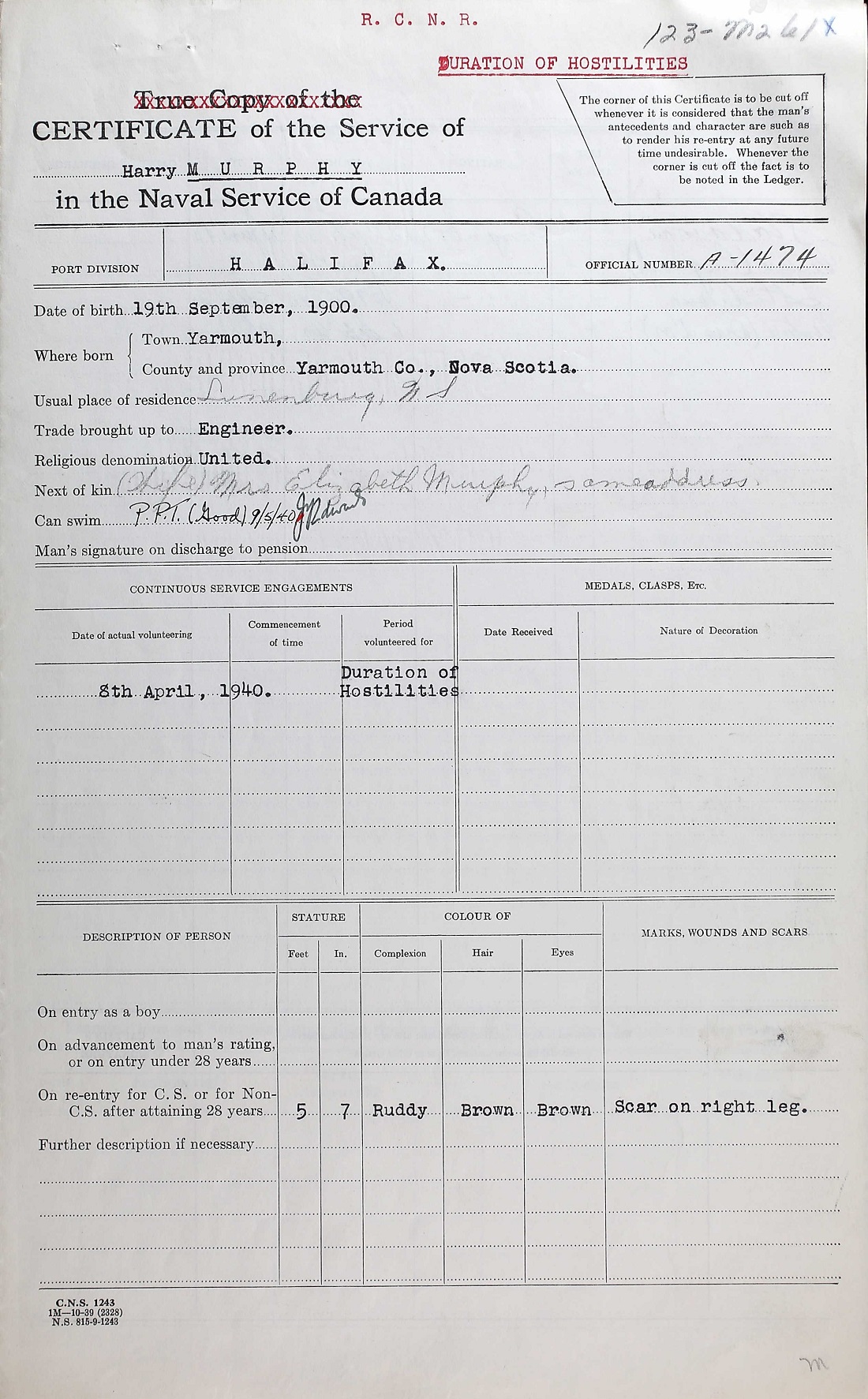 Ships served in: Tug PUGWASH - served in Pugwash 11 Jun 1940 - 26 Aug 1940 as Engineman, RCNR HMCS BRAS D'OR - drafted to Bras D'Or 10 Sep 1940 as Engineman, RCNR