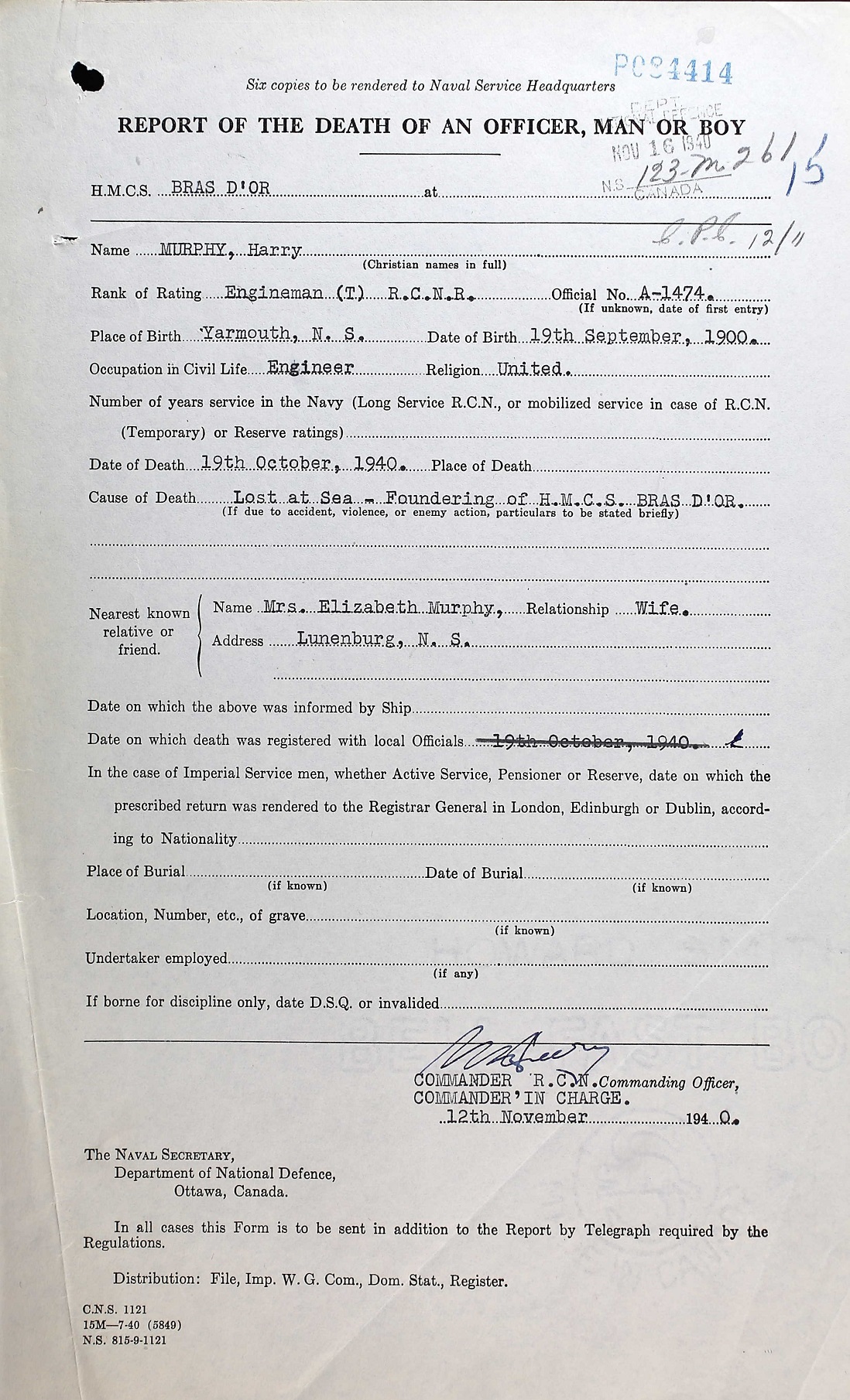 MURPHY, Harry, Engineman, A1474, RCNR, MPK - 19 Oct 1940, HMCS BRAS D'OR - son of Joseph P. Murphy, and of Annie Amelia Murphy, of Lunenburg; NS; husband of Elizabeth Florence Murphy, of Lunenburg, NS.