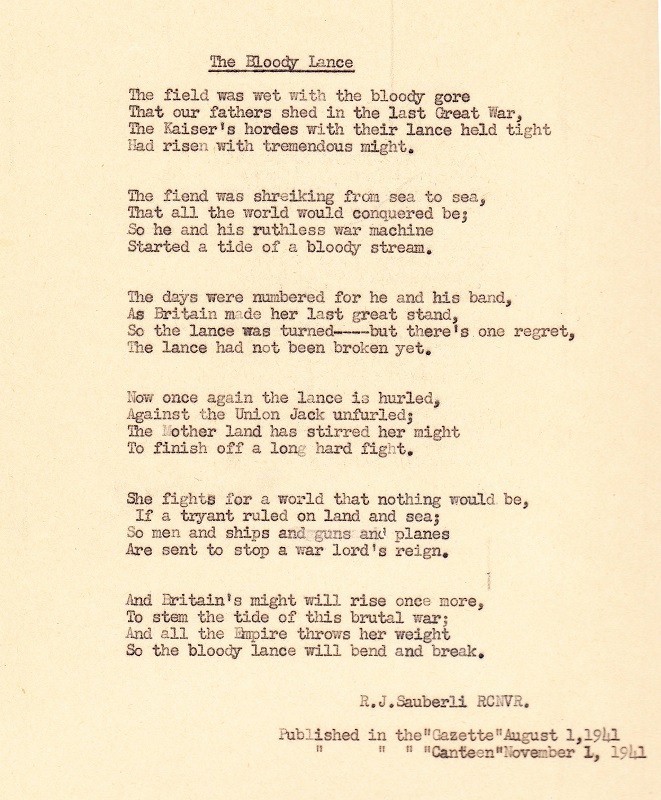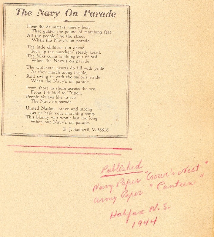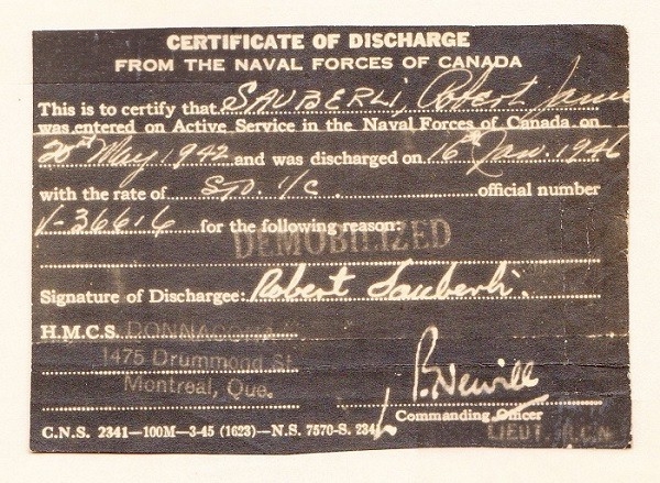 Robert Sauberli enlisted in the RCNVR on 20 May 1942 and was demobilized on 16 Jan 1946 at HMCS DONNACONA