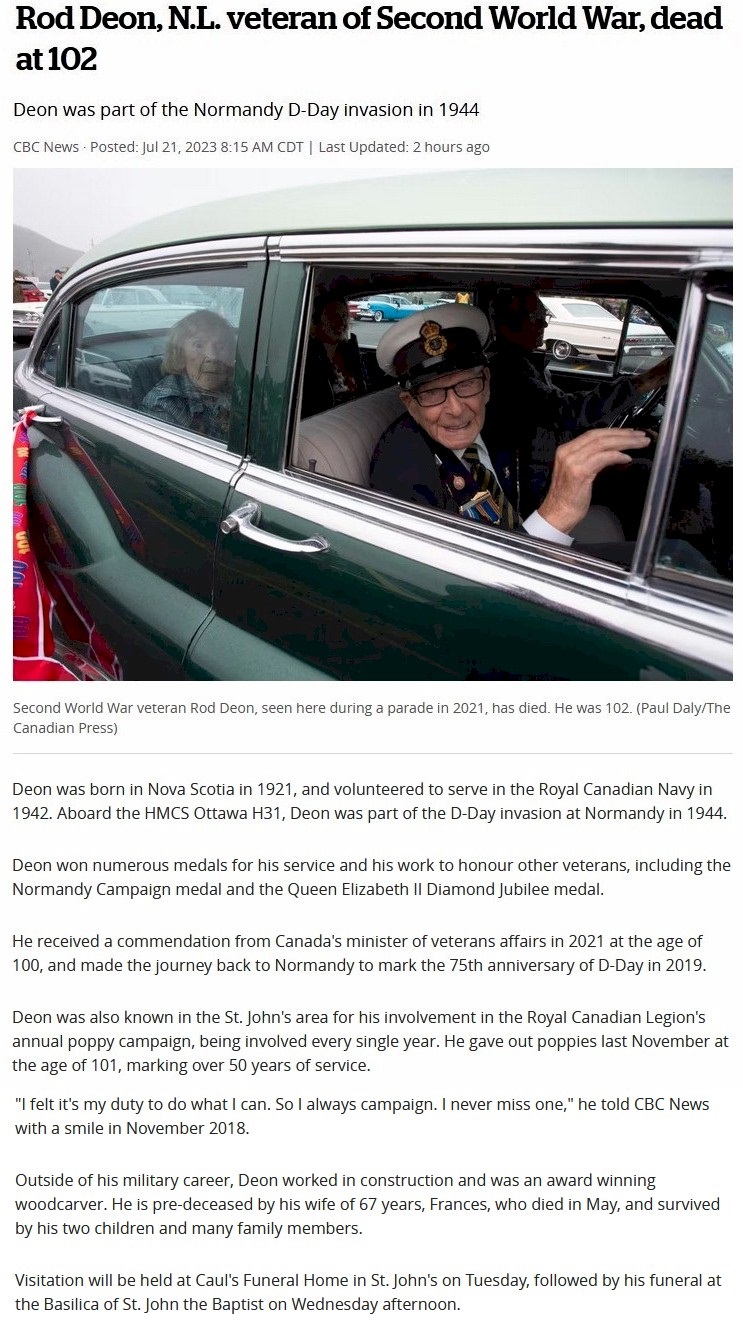 DEON, Roderick Joseph (Rod) - One of the last of the Greatest Generation, at 102 years of age, World War Two veteran Roderick Joseph Deon departed this earth at exactly 11:11p.m. - a legend to the last. He has joined Frances, his wife of 76 years, after keeping her waiting in heaven only 71 days without him. Of deep Acadian roots, Rod was born in 1921 in Pubnico, Nova Scotia, the first child of Joseph d’Eon and Evelina d’Entremont. He grew up in Lynn, Massachusetts before the outbreak of the Depression prompted the family to return to Canada in 1929. In 1942, Rod volunteered to join the Canadian Navy and served aboard the destroyer HMCS Ottawa H31, finishing his service as a Chief Petty Officer with the Engineer’s Branch. His ship was on convoy duty in the North Atlantic and took part in the Normandy Invasion (D-Day) in 1944. The Ottawa was credited with three U-boat sinkings in that same year. Following the war, he met Frances Duguay in Saint John, New Brunswick, and they married in 1947. After moving to Toronto, Ontario in 1950, they then welcomed their son, Brian, in 1951; daughter Jennifer came along 20 years later in 1971. Rod enjoyed a long career as a construction superintendent and oversaw the building of many schools and churches in the Toronto area. After retiring in his 70s, his long time hobby of woodcarving became a second career, with commissions from organizations such as the Walt Disney Company and Grant Forest Industries. Even after moving to St. John’s in 2015, Rod continued to produce award-winning relief carvings and other artworks up to the age of 100. Remembrance and service remained close to Comrade Rod’s heart throughout his life. A founding member of Branch 617 in Toronto, Rod was a lifetime member of the Royal Canadian Legion and participated in the annual poppy campaign every single year - including last year, at the age of 101. In 2019, he journeyed to France as a member of the Canadian delegation marking the 75th anniversary of D-Day. Rod’s awards and honours include the 1939-45 Star (Atlantic); the France & Germany Star; the Normandy Campaign medal; the Canadian Voluntary Service 1939-45 medal; the King George VI 1939-45 medal; and the Queen Elizabeth II Diamond Jubilee medal. In 2019, he was awarded the rank of Chevalier (Knight) of the French National Order of the Legion of Honour from the Ambassador of France to Canada. In 2021, he received a Commendation from the Minister of Veteran’s Affairs. Rod was a friend to all he met, and will be mourned by many. He is survived by his son, Brian Deon and wife, Judy Deon (Nelson, BC); daughter, Jennifer Deon and her husband, Dave Walsh with their son, John Deon-Walsh (St. John’s, NL); grandchildren, Jonathan Deon and wife, Erin Weech (Victoria, BC); Alison Deon and husband, Jeff Geddis with their daughters, Gwendolyn and Grace (Toronto, ON); sisters ,Sylvia Martell (Pubnico) and Anne Vitaline Blondeau (Montreal); as well as many nephews and nieces and cousins in Nova Scotia, Ontario and Florida. He is predeceased not only by his parents and beloved wife, but also his brother, Father Harland d’Eon and sister, Zelma d’Deon Sharpe. The family wishes to thank especially Rod’s loving team of care companions who have spent so much time with him over the last few years. A visitation will be held at Cauls Funeral Home, LeMarchant Road, St. John’s, on Tuesday, July 25 from 12-3p.m. and 6-9p.m. All are invited to attend the Funeral Mass to be held at The Basilica of St. John the Baptist on Wednesday, July 26 at 2p.m. Following the Mass, the funeral procession will travel to the Field of Honour located at Memorial Gardens Cemetery, in the St. John's neighbourhood of Galway for an internment with Military Honours. (His beloved wife Frances will also be interred with him at this time.) Those who are unable to attend the Mass in person but are wishing to do so virtually, please visit https://www.thebasilica.net/live/. In lieu of flowers, please consider becoming a member of your local branch of the Royal Canadian Legion (anyone may do so) and/or making a donation to the Poppy Campaign - both may be arranged through Legion.ca (The Saltwire Network 21 Jul 2023)