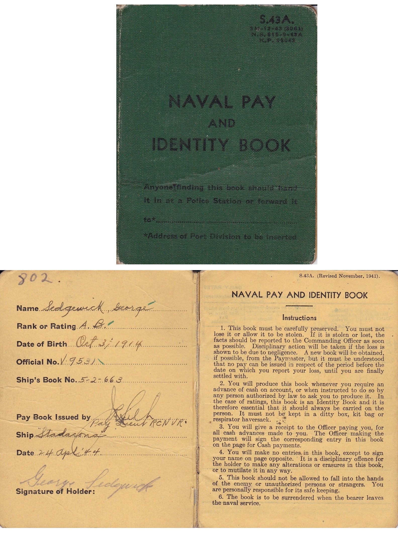 (JS01) Portrait of Seaman Jack Sedgwick (JS02) Jack's Naval Identity disc (JS03) Jack's Naval pay and Identity book (JS04) Service documents for John George (Jack) Sedgwick