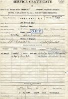 Ships served in: HMCS SANS PEUR - Served in SANS PEUR 04 Dec 1940 - 03 Feb 1941 as an OS, RCNVR // 01 May 1941 - 11 Apr 1942 as an OS / AB, RCNVR. Rated Able Seaman 24 May 1941 HMCS HUSKY - Served in HUSKY 30 Sep 1942 - 17 Dec 1942 as an AB, RCNVR