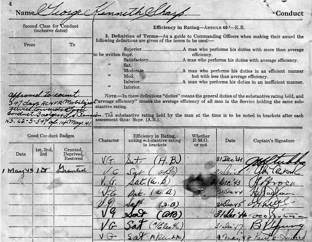 Ken transferred from the RCNVR to the RCN in 1941. It is not known how long Ken stayed in the RCN after the war or what ships he served in after the war. His conduct sheet has an entry of 09 May 1948