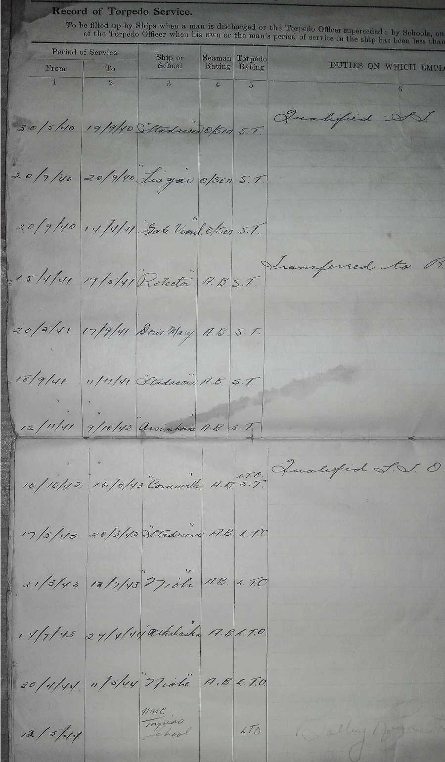Ships served in: (based on his Record of Torpedo Service) HMCS LISGAR - served in Lisgar 30 Jun 1940 - 19 Sep 1940 as an OS.ST, RCNVR // 18 Sep 1941 - 11 Nov 1941 as an AB.ST, RCNVR HMC "Gate Vessel" - Served in "Gate Vessel" 20 Sep 1940 - 14 Apr 1941 as an OS.ST, RCNVR HC 40 (DORIS MARY) - Served in HC-40 20 May 1941 - 17 Sep 1941 as an AB.ST, RCN HMCS ASSINIBOINE - Served in Assiniboine 10 Oct 1942 - 16 Mar 1942 as an AB.ST / LTO, RCN HMCS ATHABASKAN - Served in Athabaskan 13 Jul 1943 - 29 Apr 1944 as an AB.LTO, RCN. Survived the sinking of Athabaskan. Rescued by Haida. AB.LTO, at the time of the sinking.
