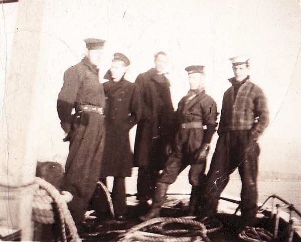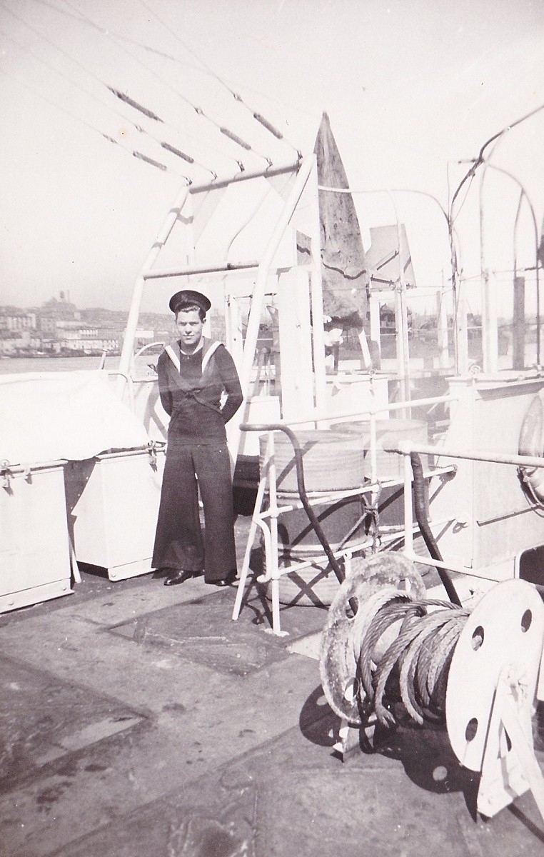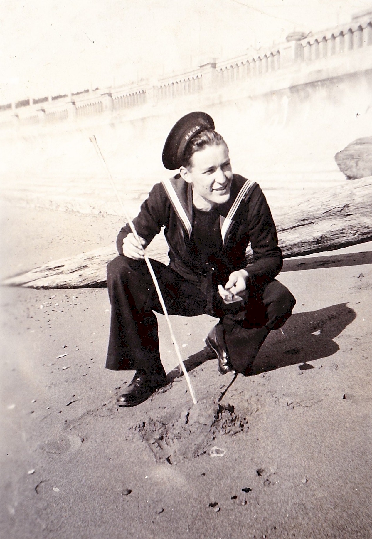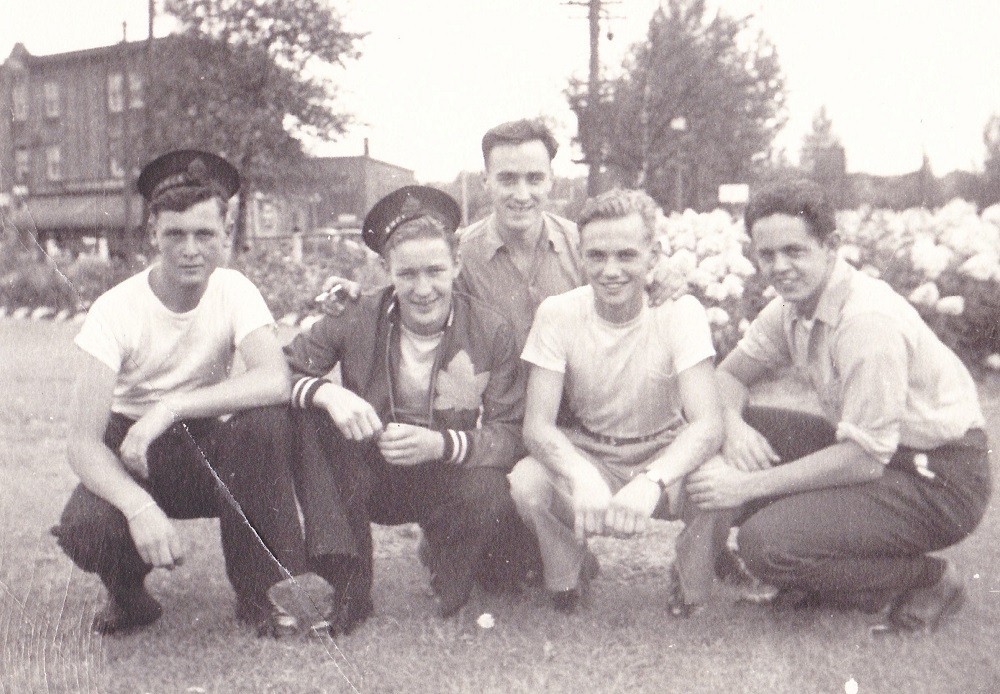(1) Hamilton Skilling on a beach - place unknown (2) Norm and Friends on a Corvette. "The odd one from either end - Request for marriage leave" (3) Hamilton Skilling beside train (4) Hamilton Skill (right) & friend at Chapleau train station, Ontario (5) Hamilton Skilling (2nd from left) and friends (this photo was possibly taken during the same train trip as photos 1 & 2) (6) An Atlantic convoy - photo possibly taken from HMCS Winnipeg J337 (7) Unknown sailor on unknown ship - possibly HMCS Winnipeg J337