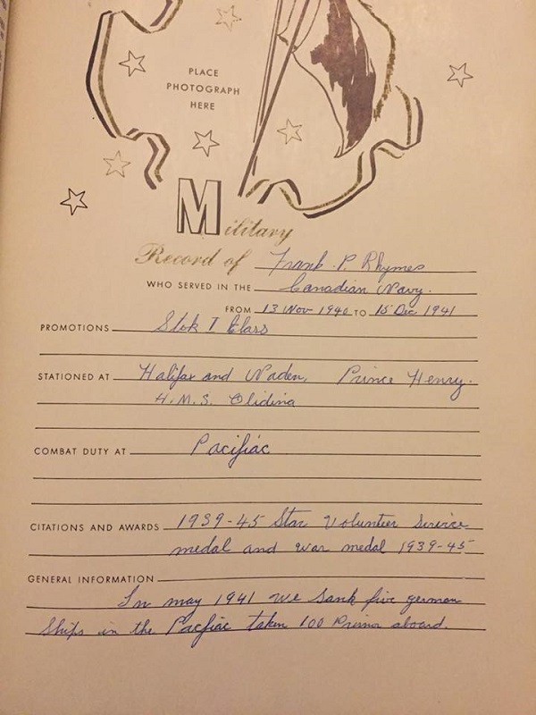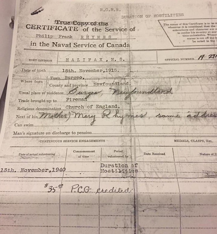 Ships served in: (1) Portrait of Seaman Rhymes (2) Certificate of Service (3) Information written by Frank Phillip Rhymes on his service in the RCNR (4) Frank's headstone at the Fort Massey Cemetery, Halifax, NS