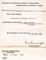 Ships served in: HMCS LETHBRIDGE - Appointed to Lethbridge 22 Apr 1943 as SLt, RCNVR. Appointed Lt, RCNVR with seniority 13 Jul 1943 (Canadian Navy List Nov 1943) Appointed XO 27 Dec 1943. Appointed CO 18 Aug 1944 - 9th Commanding Officer HMCS STE THERESE - Appointed to Ste Therese 22 Feb 1945 as Lt, RCNVR (Canadian Navy List Mar 1945) HMCS DISCOVERY - ships served in for summer training while at HMCS Discovery listed below HMCS CAYUGA - Appointed to Cayuga 20 Jul 1953 as Lt, RCNR HMCS BROCKVILLE - Served in Brockville 23 Jul 1954 - 23 Aug 1954 as TAS officer HMCS CORDOVA - Served in Cordova 20 Jun 1955 - 01 Jul 1955 as a LCdr, RCNR HMCS NEW GLASGOW - Served in New Glasgow 04 Aug 1958 - 15 Aug 1958 as Cdr, RCNR HMCS SKEENA - Served in Skeena 03 Aug 1959 - 15 Aug 1959 as Cdr, RCNR