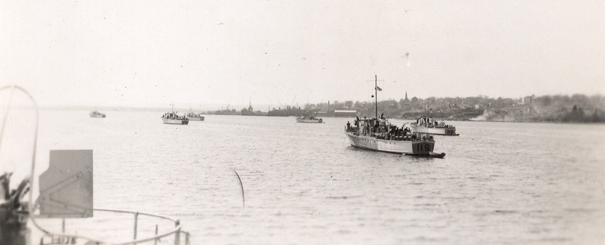 (ARP027) Q117 alongside U-889. Boarding party raises White Ensign on U-889 (ARP028) U-889 with 3 Fairmiles. Q121 on right. RCAF flying boat overhead (ARP029) U-889 underway with White Ensign. Q121 in background. Unknown Fairmile in foreground (ARP030) U-889 underway with prize crew. Q118 followed by Q117 on left, frigate in background either Buckingham or Inch Arran (APR031) U-889 with 3 Fairmiles. Lead Fairmile unknown, 2nd is Q121 and 3rd is Q117 with German POWs on fo'c's'le