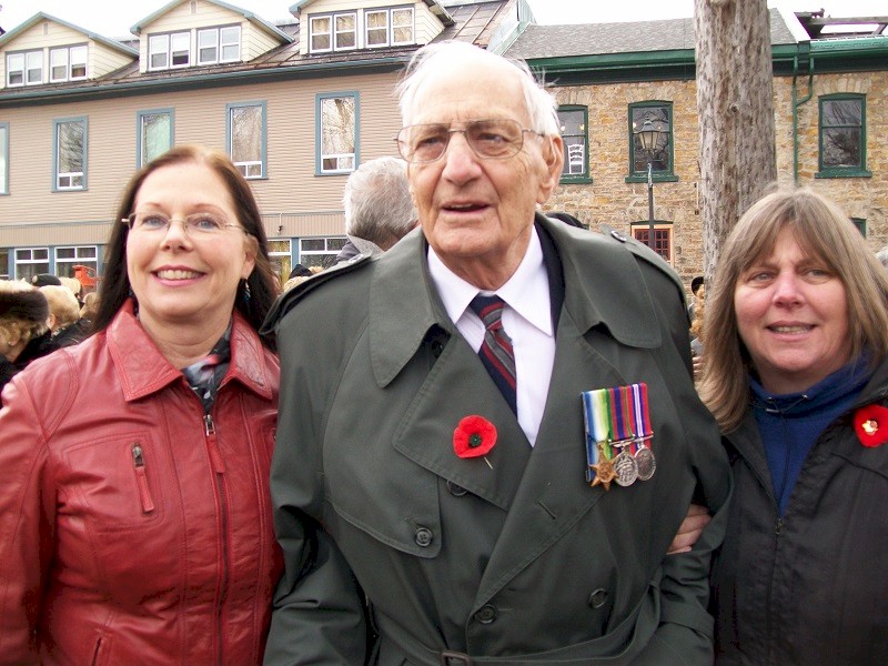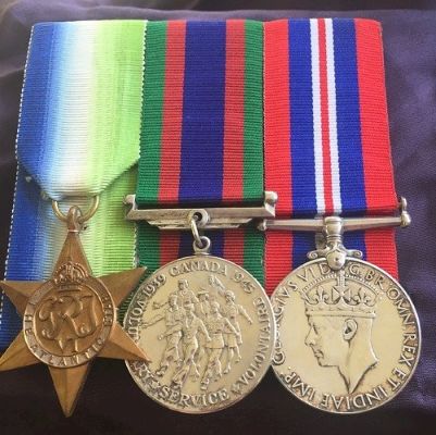 (RNP007) Robert Plumpton with his daughters Dianne and Cindy on Remembrance Day - 2014 (RNP008) Robert's medals: The Atlantic Star - The CVSM - The War Medal 1939-45 Courtesy of Joan Currie