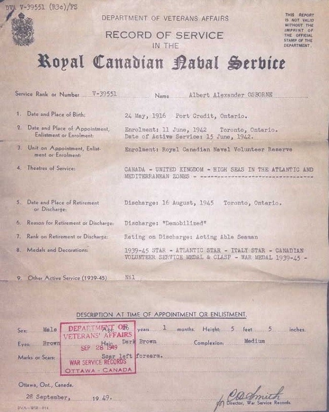 Albert volunteered for the RCNVR at HMCS York on 11 Jun 1942 and was demobilized at HMCS York on 16 Aug 1945.