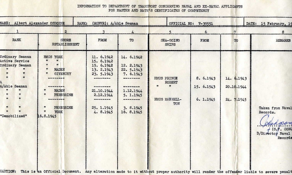(1) Albert Osborne (2) Albert Osborne circa 1944 (3) Albert Osborne (4) Record of Service (5) Statement of Service (6) Information to Dept of Transport concerning Naval and ex-Naval applicants for Master and Mate's Certificates of Competency (7) Shipping out from HMCS York to HMCS Naden for training