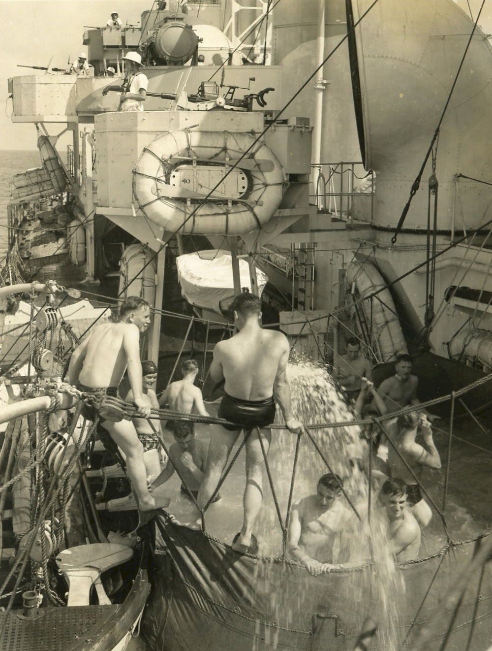 (AN012) A view of HMCS PRINCE ROBERT from her fo'c's'le (AN013) Albert Osborne and shipmate somewhere down south (AN014) Albert Osborne somewhere down south (AN015) A "dip in the pool" on HMCS PRINCE ROBERT