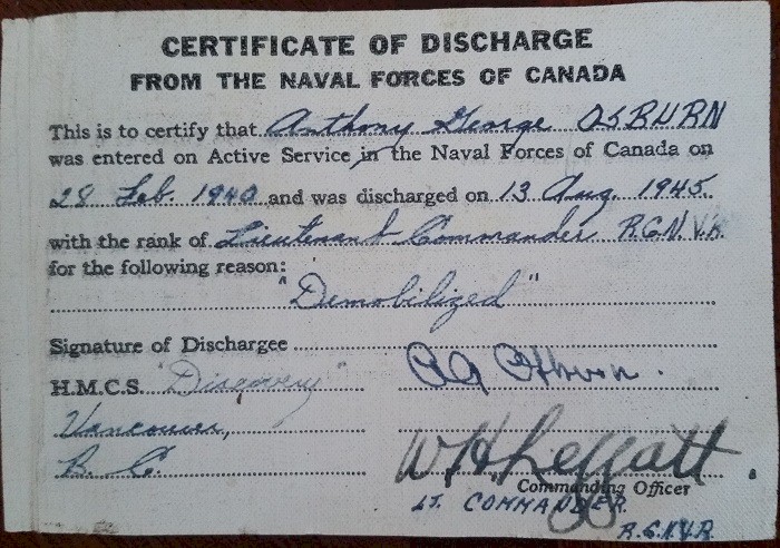 OSBURN, Anthony George (Tony), M.I.D., LCdr, RCNVR on Monday, August 4th, 2003. Age 96. Predeceased by his wife Babs in 1990. Survived by family and friends too numerous to mention. A gathering will be held on Tuesday, August 12th, 2:30 P.M. at the Vancouver Club, 915 West Hastings Street. In lieu of flowers, donations can be sent to The Salvation Army, 201-3833 Henning, Burnaby V5C 6N5.