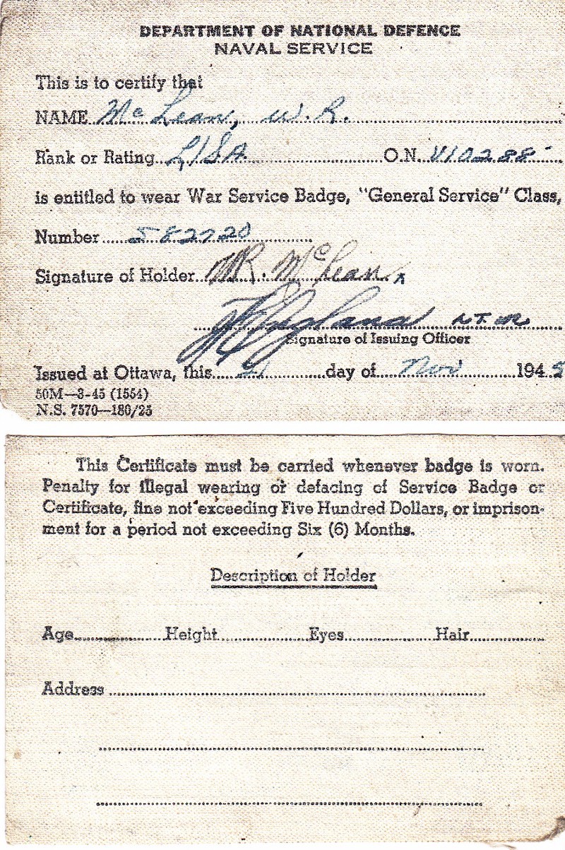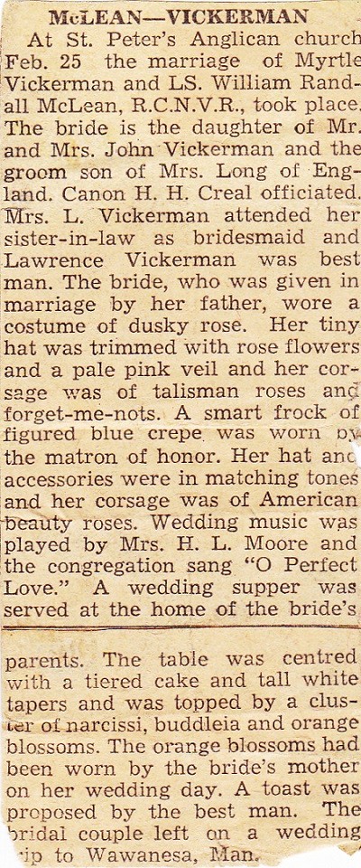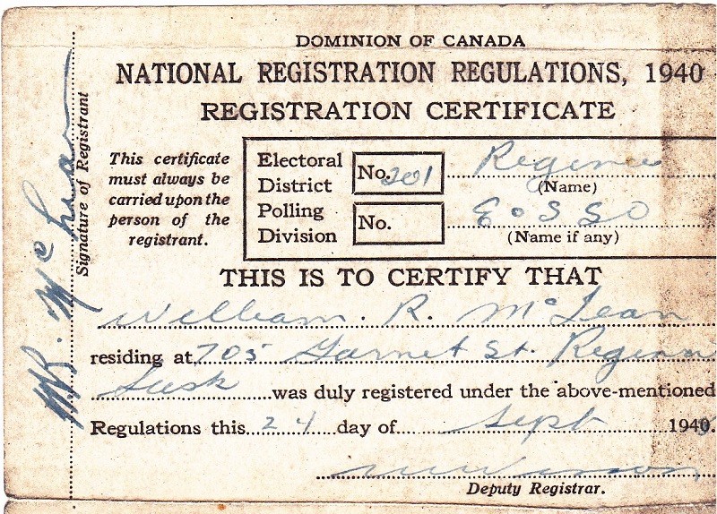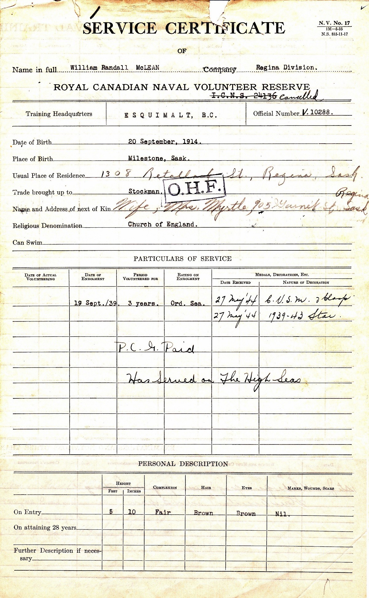 (1) Portrait of L/SA McLean  (2) Portrait of William McLean  (3) Seaman McLean  (4) Voter registration Certificate  (5) Newspaper article on calling up of RCNVR personnel from Regina  (6) Wedding announcement for Myrtle Vickerman and William McLean  (7) Letter William received from the Minister of Labour when he returned home to Regina after the war