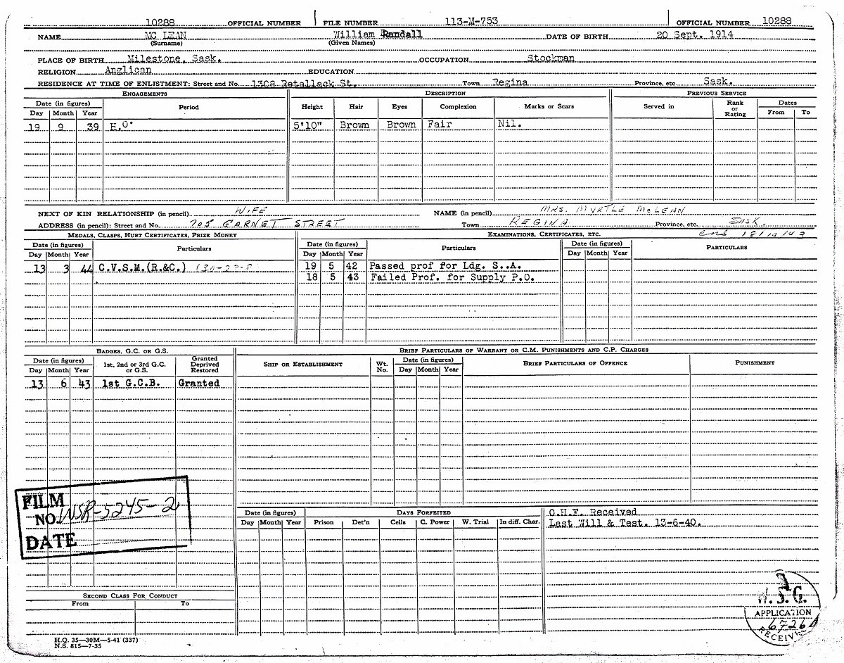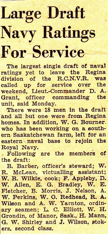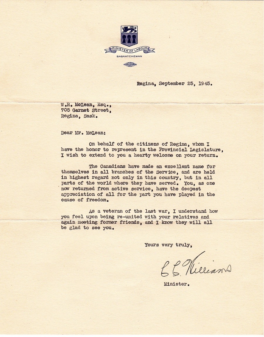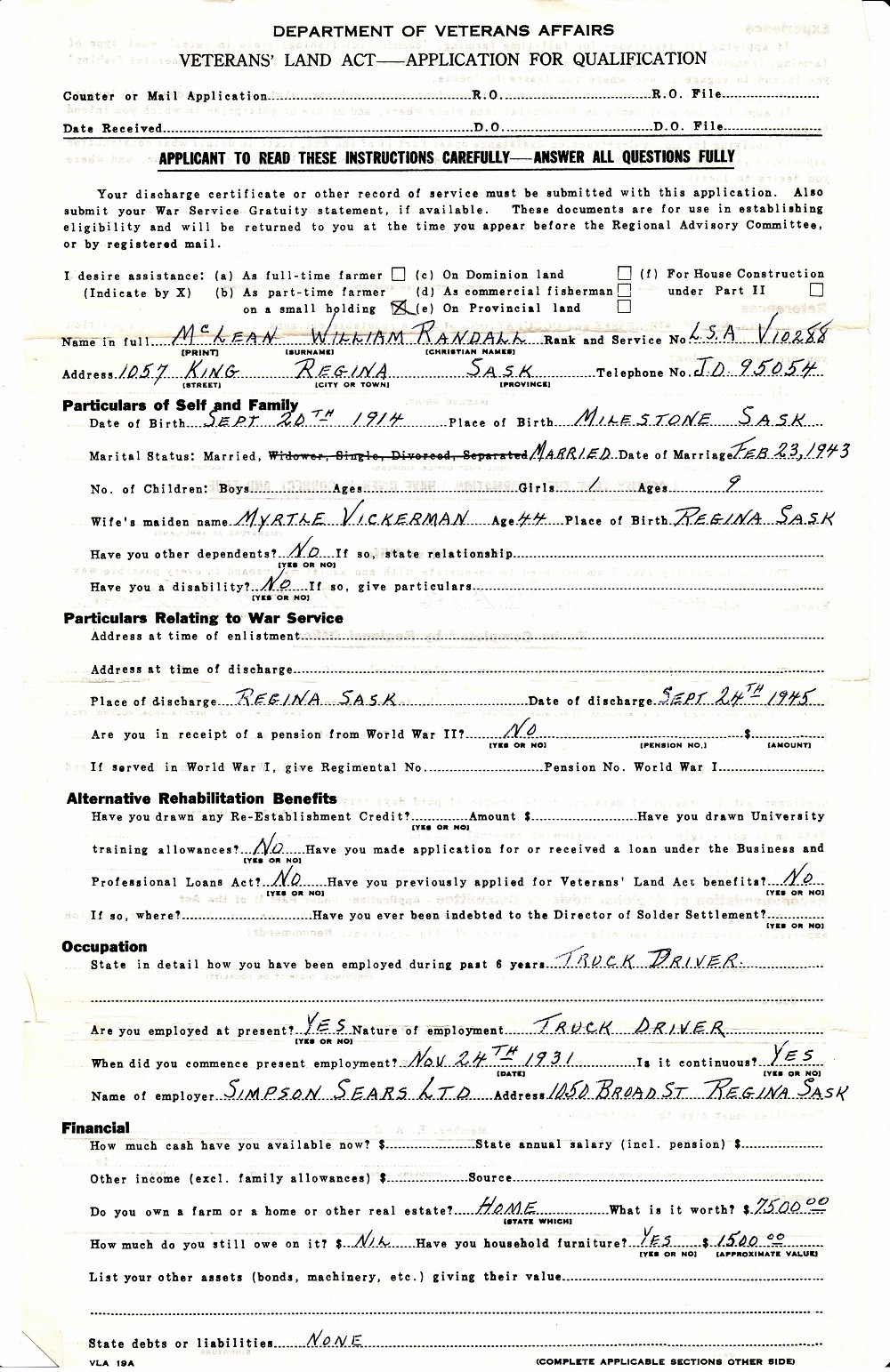 (1) Portrait of L/SA McLean  (2) Portrait of William McLean  (3) Seaman McLean  (4) Voter registration Certificate  (5) Newspaper article on calling up of RCNVR personnel from Regina  (6) Wedding announcement for Myrtle Vickerman and William McLean  (7) Letter William received from the Minister of Labour when he returned home to Regina after the war