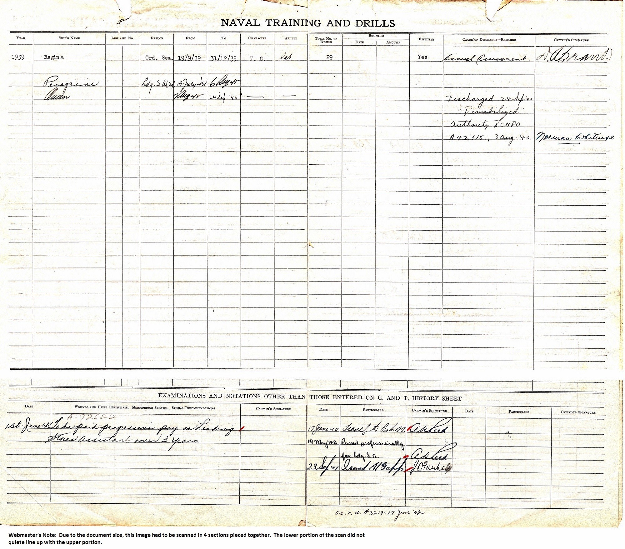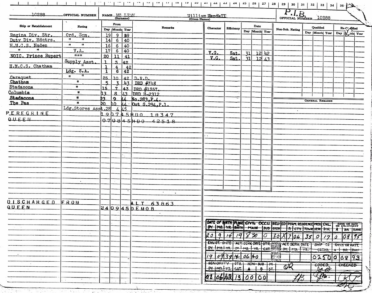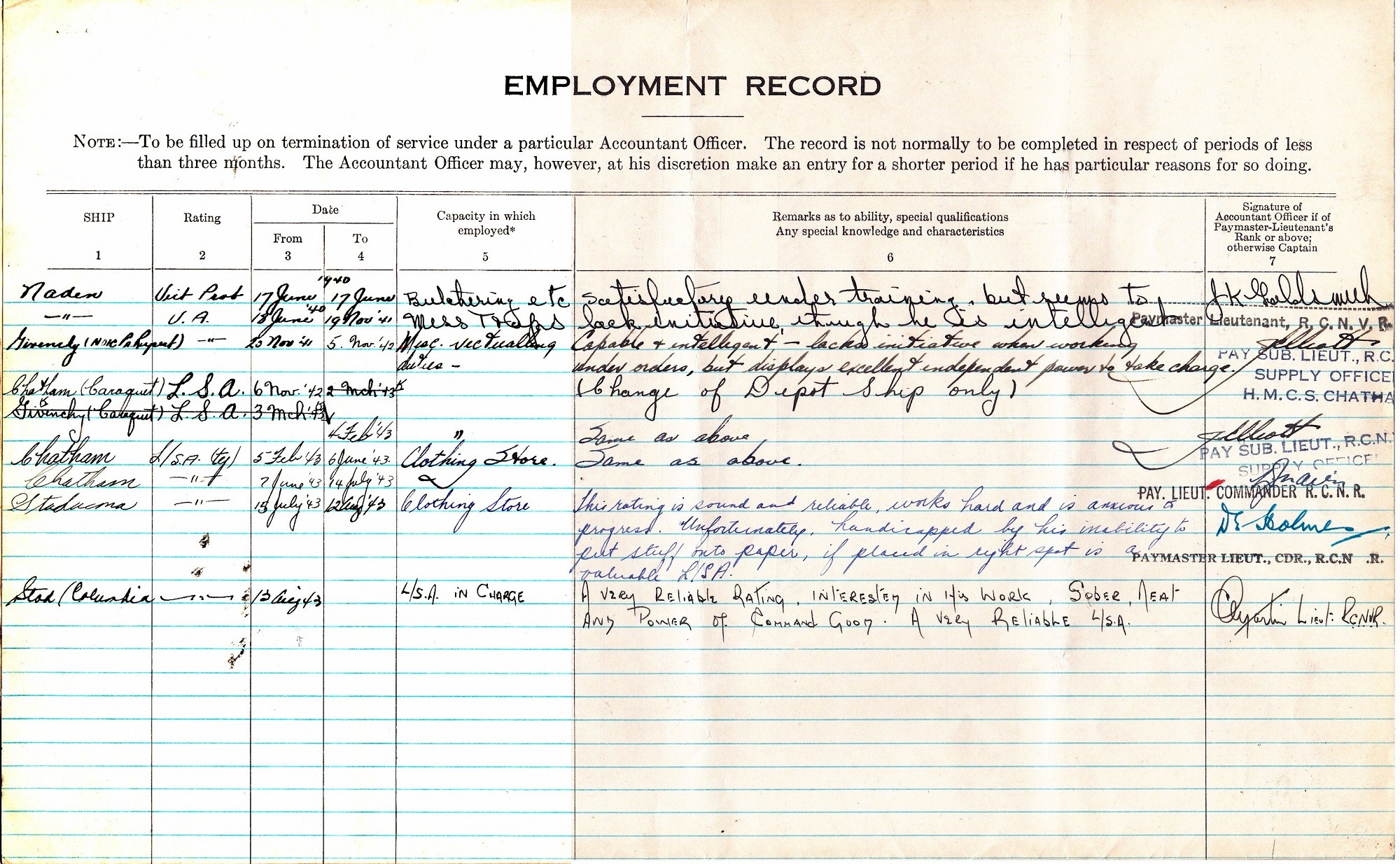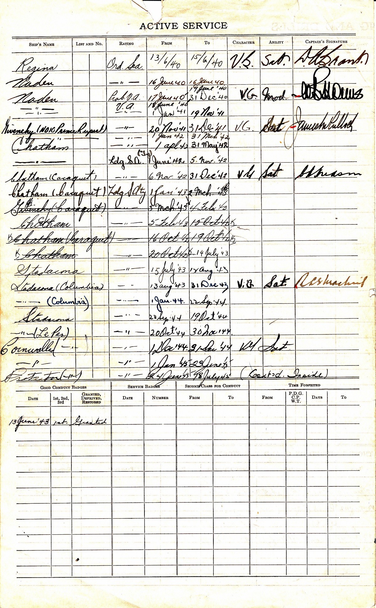 HMCS CHATHAM - Served in Chatham 01 Apr 1942 - 05 Nov 1942 as a VA and L/SA, RCNVR. Rated Leading Stores Assistant 01 Jun 1942  //  Served in Chatham 05 Mar 1943 - 14 Jul 1943 as a L/SA, RCN