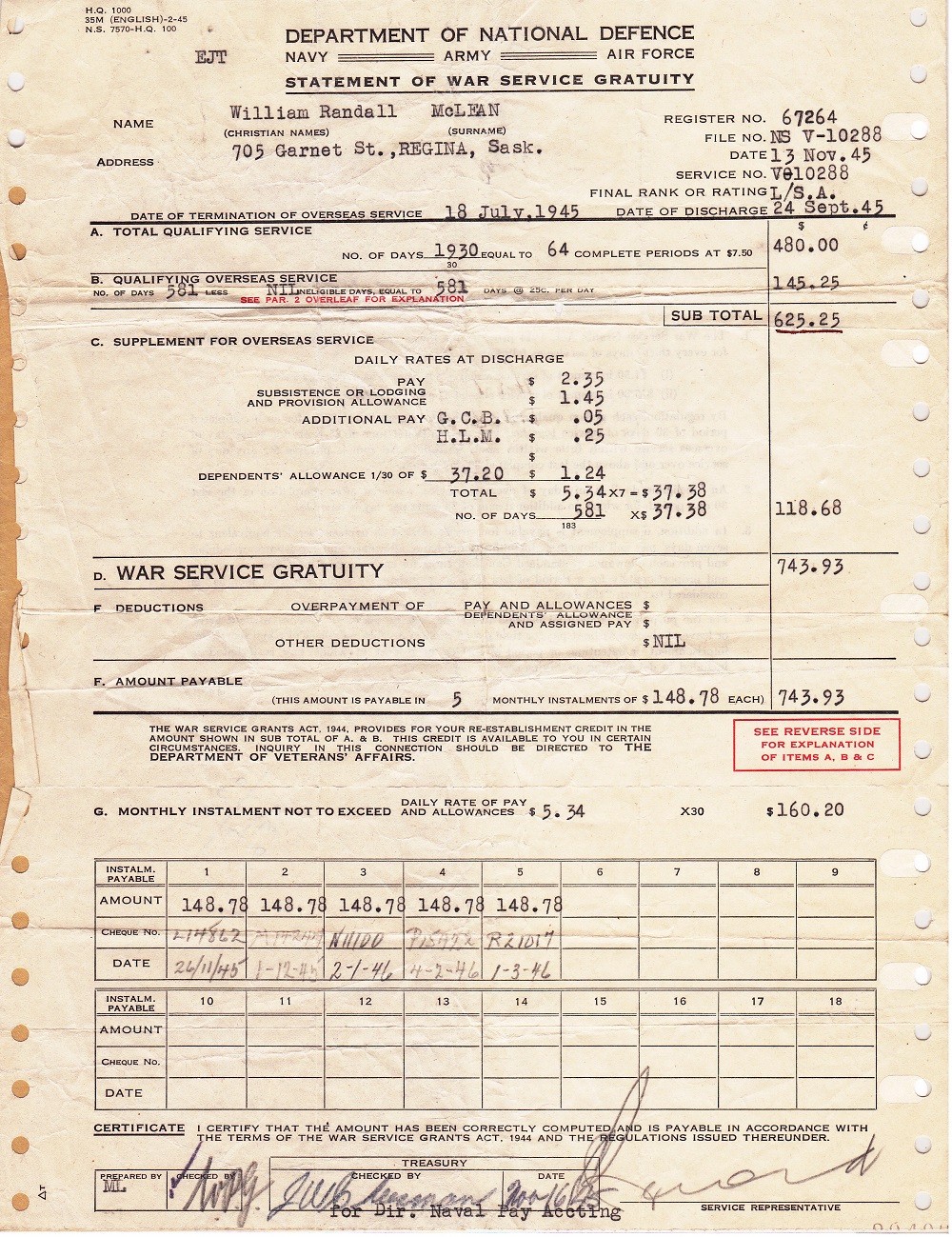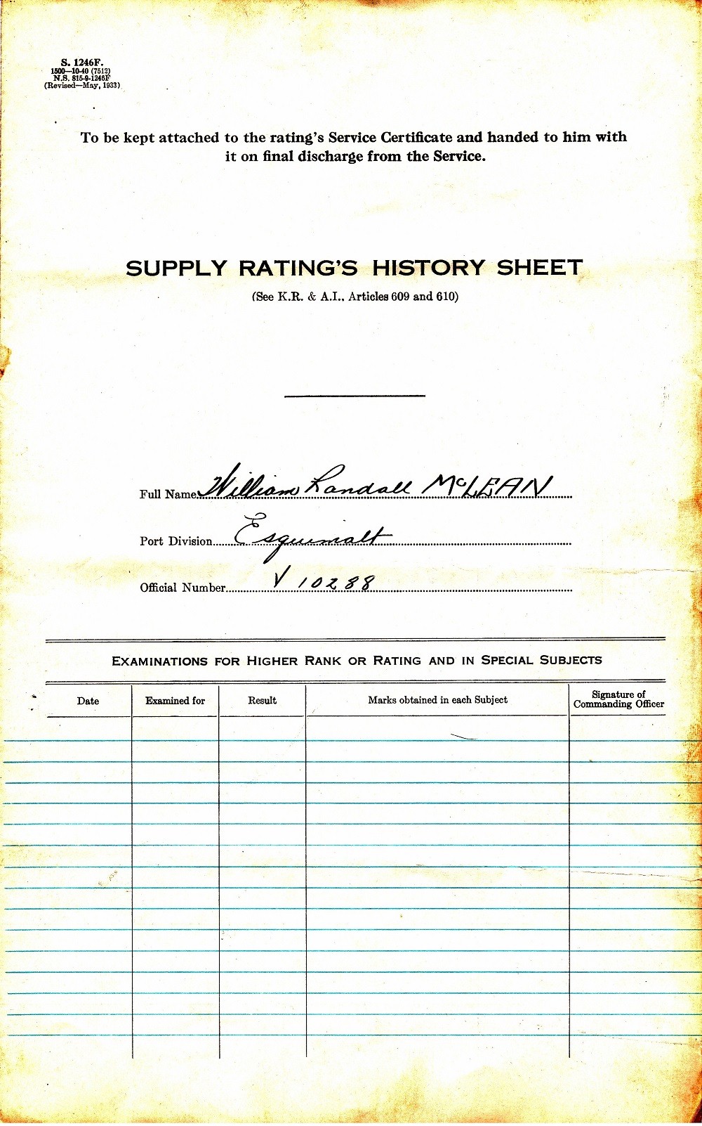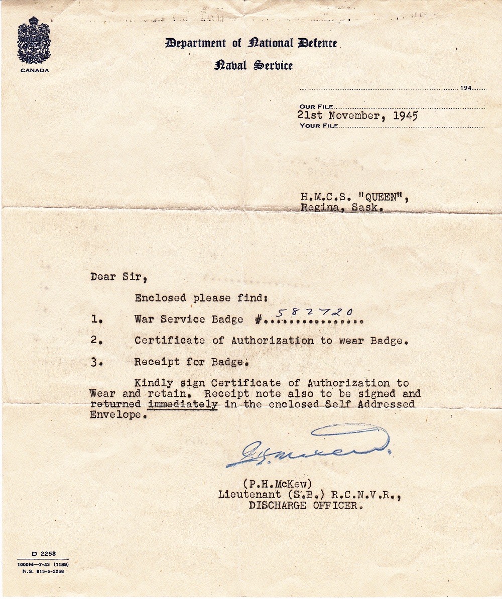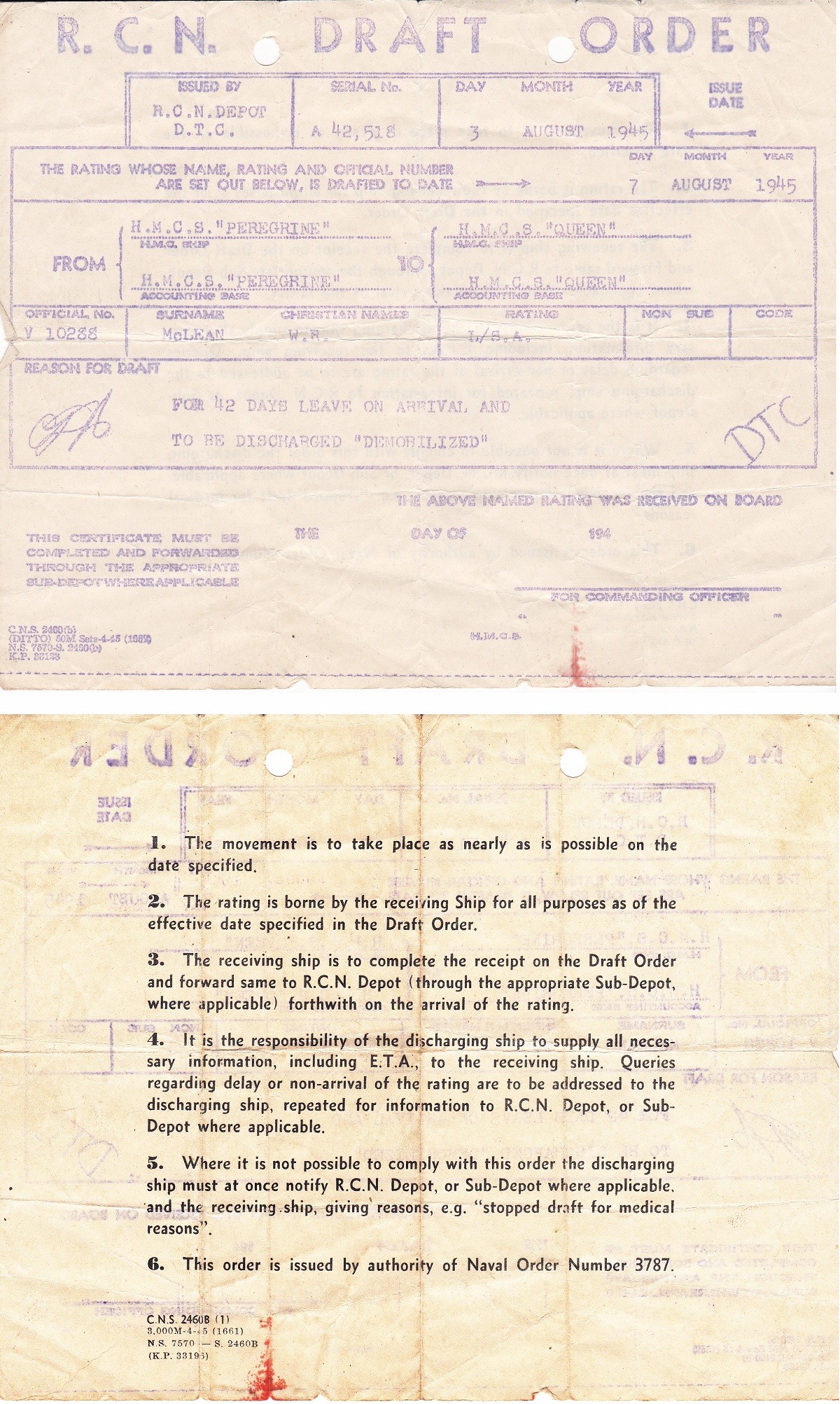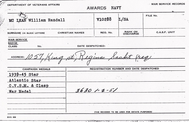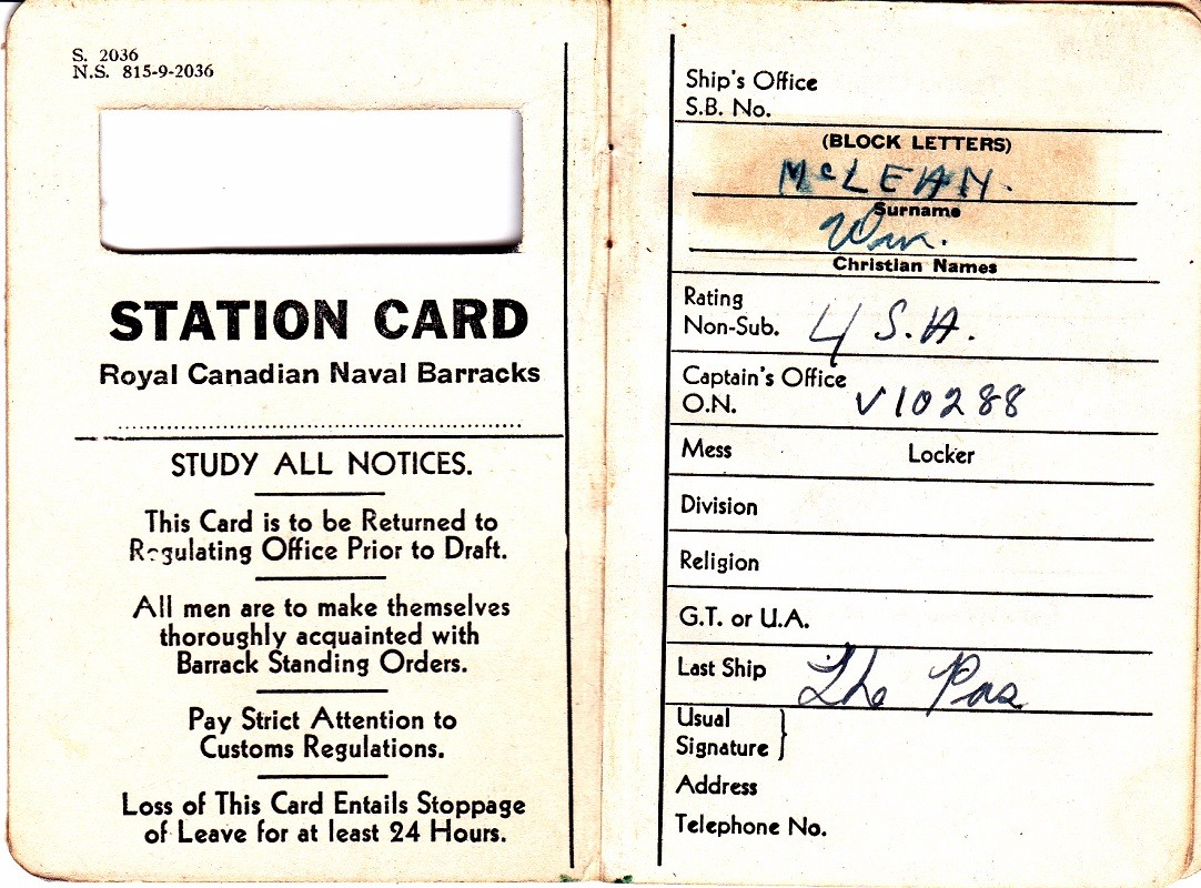 HMCS THE PAS - Served in The Pas 20 Oct 1944 - 18 Jul 1945. Rated Leading Supply Assistant 28 Apr 1945