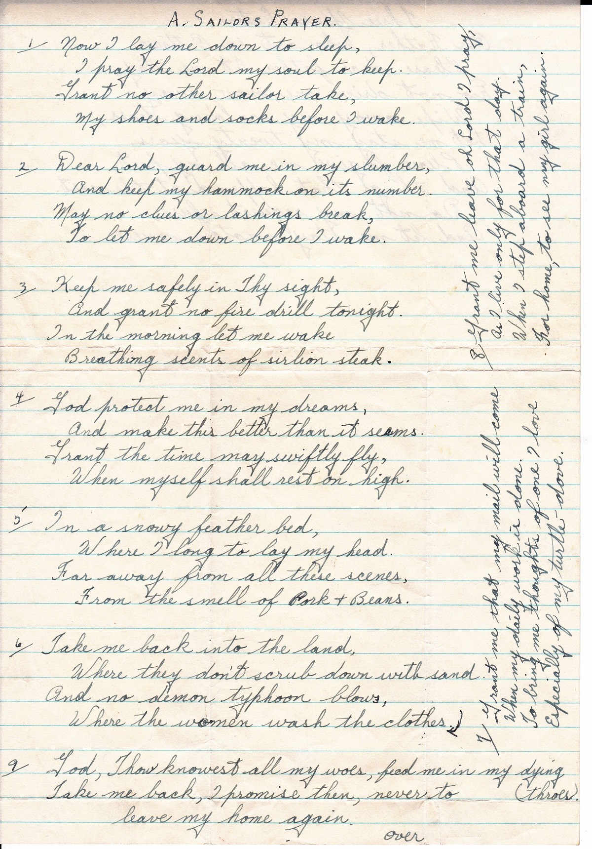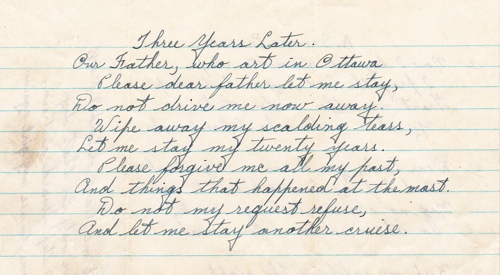 (28-32) William McLean's Station Card for HMCS Protector, Sydney, NS  (33) Poem - A Sailor's Pray. Copied down by William, the author and original source is unknown  (34) Poem - Three Years Later. Copied down by William, the author and original source is unknown