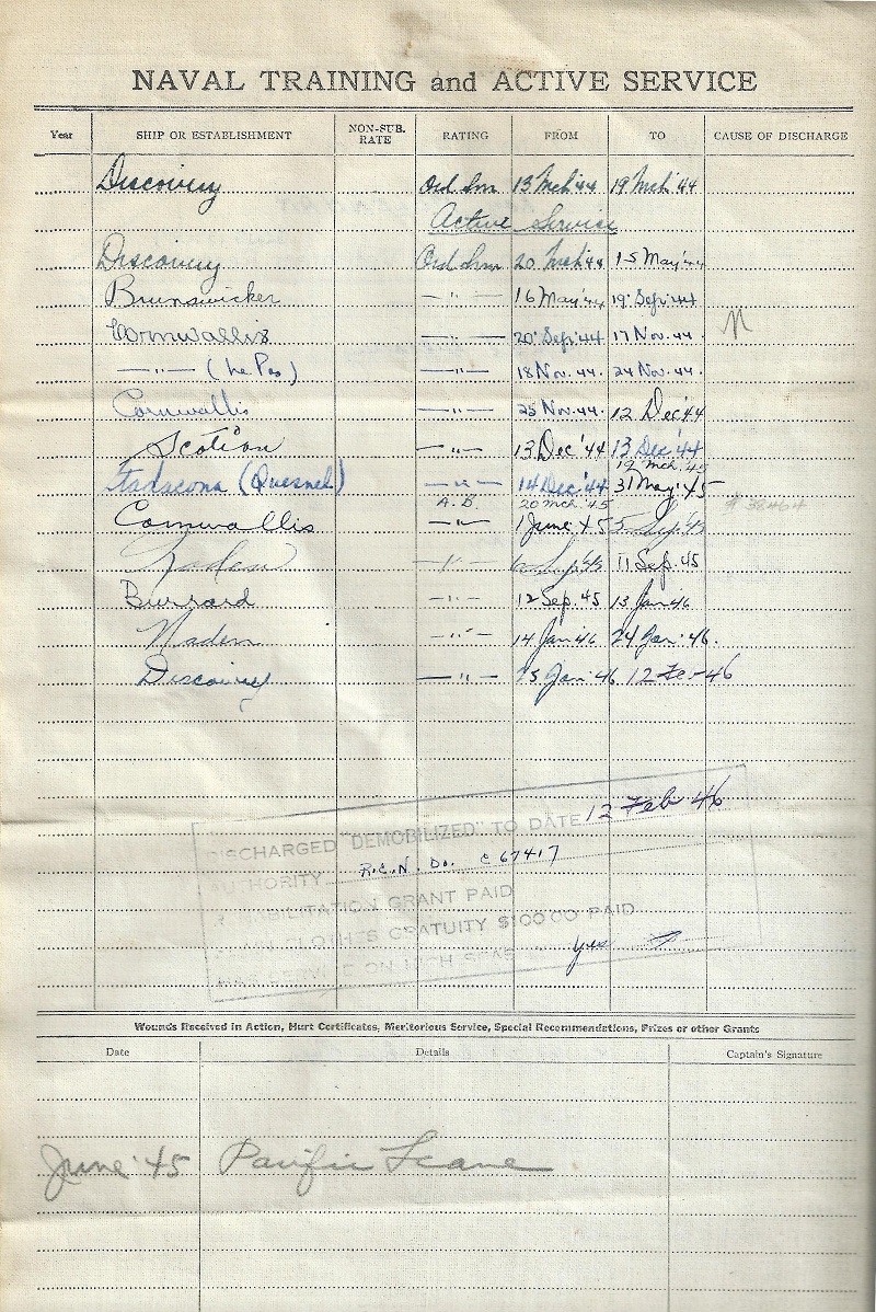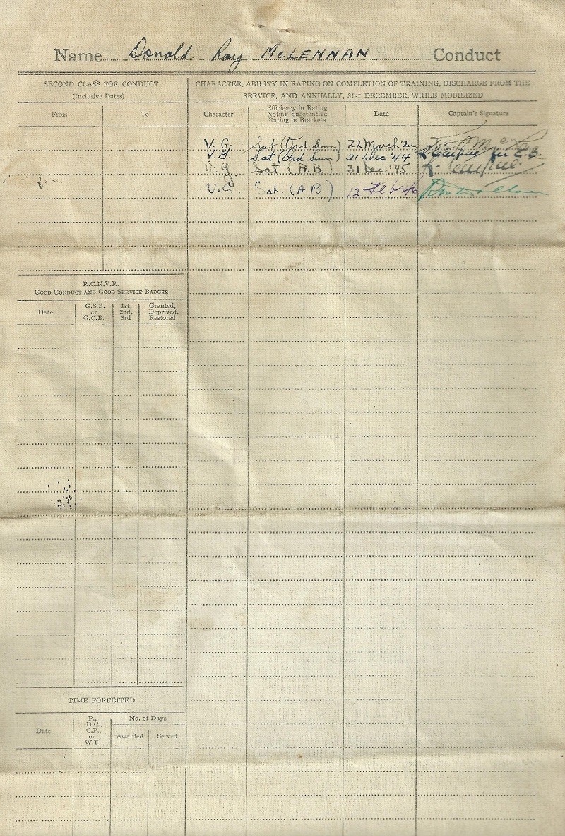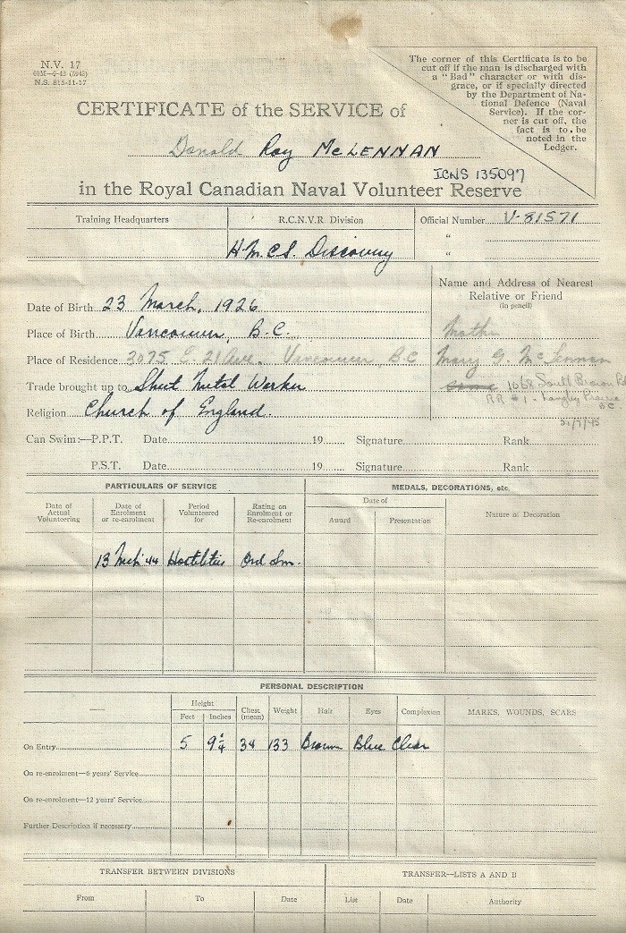 Donald volunteered for the RCNVR at HMCS Discovery on 13 Mar 1944 and began active service on 20 Mar 1944. He was demobilized at HMCS Discovery on 12 Feb 1946.