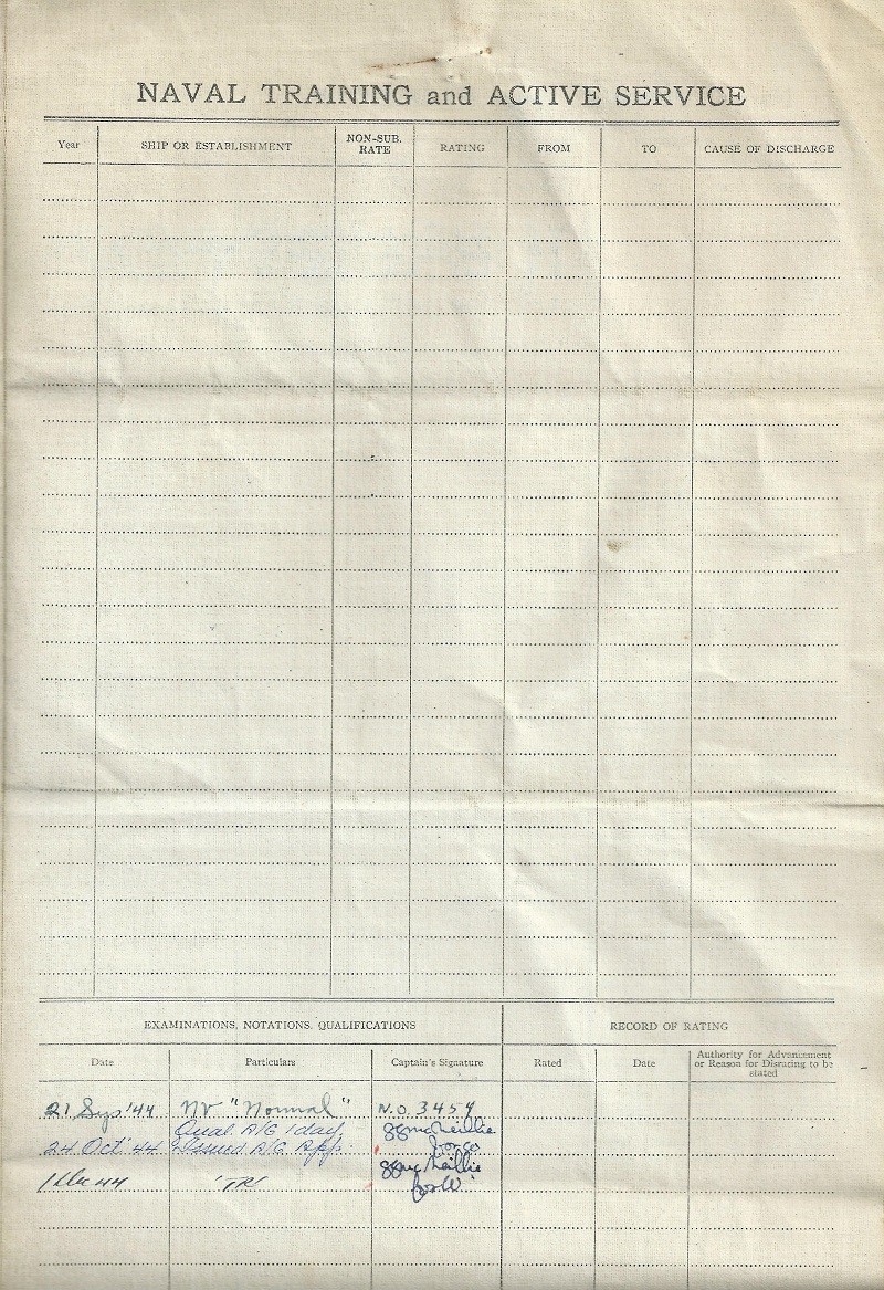 (1) Certificate of Service (2-3) Naval Training and Active Service record (4) Conduct record (5-6) "In training". All the sailors in these two photo served in HMCS Quesnel K133