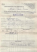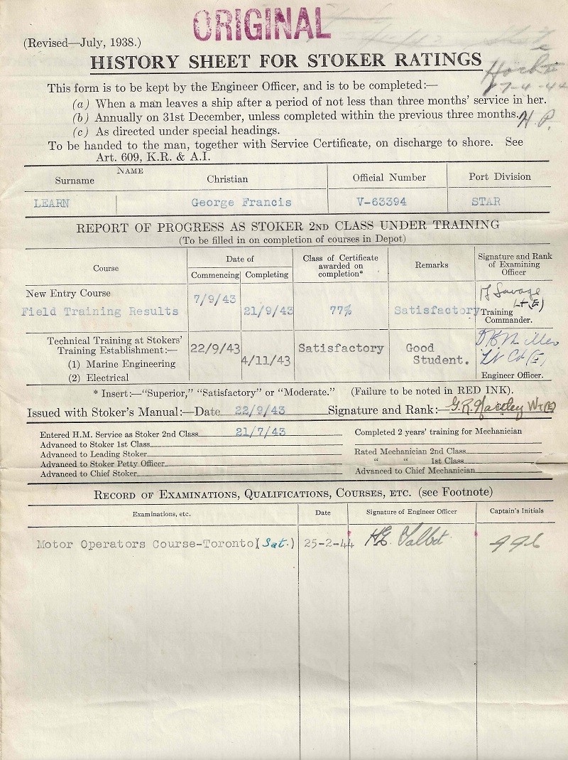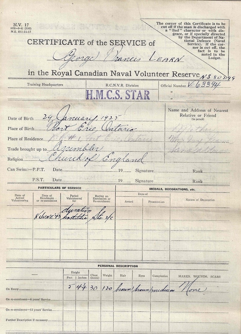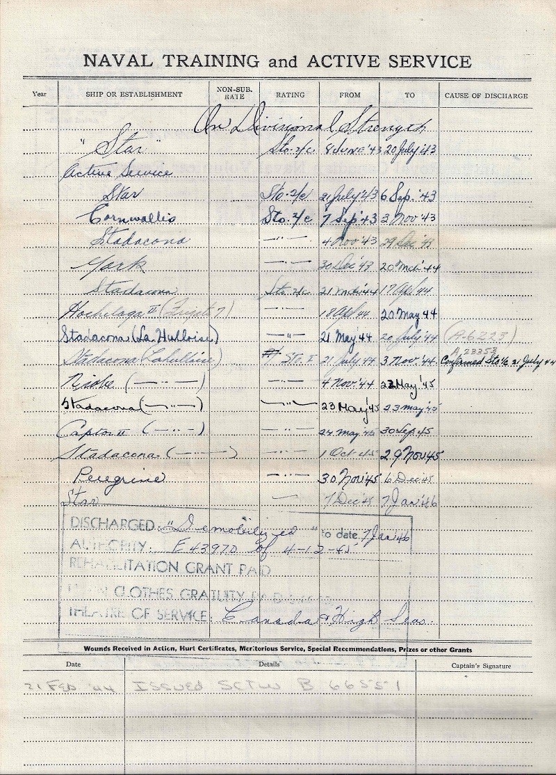 Ships served in: HMCS STAR - Enlisted 08 Jun 1943 * Commenced Active Service 21 Jul 1943 as a Stoker 2nd Class, RCNVR HMCS CORNWALLIS - Drafted to CORNWALLIS 07 Sep 1943 HMCS STADACONA - Drafted to STADACONA 04 Nov 1943 HMCS YORK - Drafted to YORK 30 Dec 1943 HMCS STADACONA - Drafted to STADACONA 04 Nov 21 Mar 1944 HMCS HOCHELAGA II - Drafted to HOCHELAGA II (for Frigate # 7) 18 Apr 1944 HMCS LA HULLOISE - Drafted to LA HULLOISE 20 May 1944. Commissioning / Paying off crew HMCS PEREGRINE - Drafted to PEREGRINE 30 Nov 1945 HMCS STAR - Drafted to STAR 07 Dec 1945 * Demobilized 07 Jan 1945