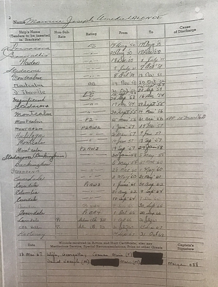 Ships served in: HMCS DONNACONA - Enlisted 19 Aug 1950 HMCS MONTCALM - Served in Montcalm 08 Oct 1951 - 20 Oct 1952 as an OS an AB.WR, RCN. Rated AB 19 Nov 1951 HMCS D'IBERVILLE - Served in D'Iberville 21 Oct 1952 - 23 Sep 1953 as an AB and LS.WR, RCN. Rated LS 15 Sep 1953 HMCS MAGNIFICENT - Served in Magnificent 24 Sep 1953 - 16 Dec 1954 as a LS.WR, RCN HMCS MONTCALM - Served in Montcalm 30 Sep 1955 - 19 Mar 1957 as a LS and P2WR and P2AW2, RCN. Rated PS 15 Mar 1956. Trade designation change 01 Jan 1957 HMCS MONTCALM - Served in Montcalm 10 Jun 1957 - 18 Sep 1957 as a P2AW2 and P2AW3, RCN. HMCS BUCKINGHAM - Served in Buckingham 30 Jan 1958 - 27 Mar 1960 as a P2AW3, RCN HMCS KOOTENAY - Served in Kootenay 14 Sep 1967 - 01 Mar 1970 as a P1WR and C2WR. Moe was a P1WR on Kootenay at the time of the explosion. HMCS SASKATCHEWAN - Served in Saskatchewan 02 Mar 1970 - 07 Jul 1970 as a MWO(S) (CPO2) Clk Adm 831, C.A.F.
