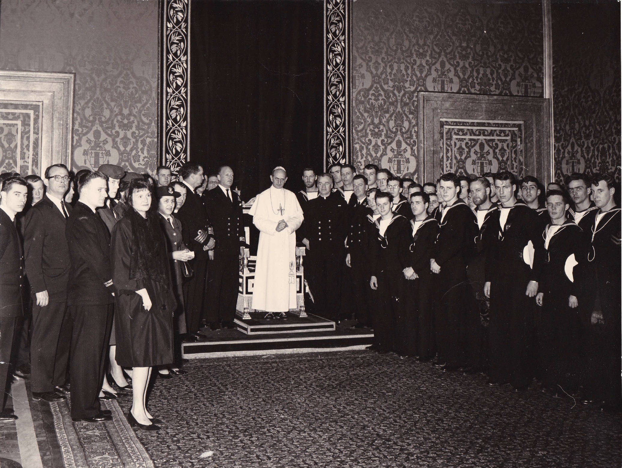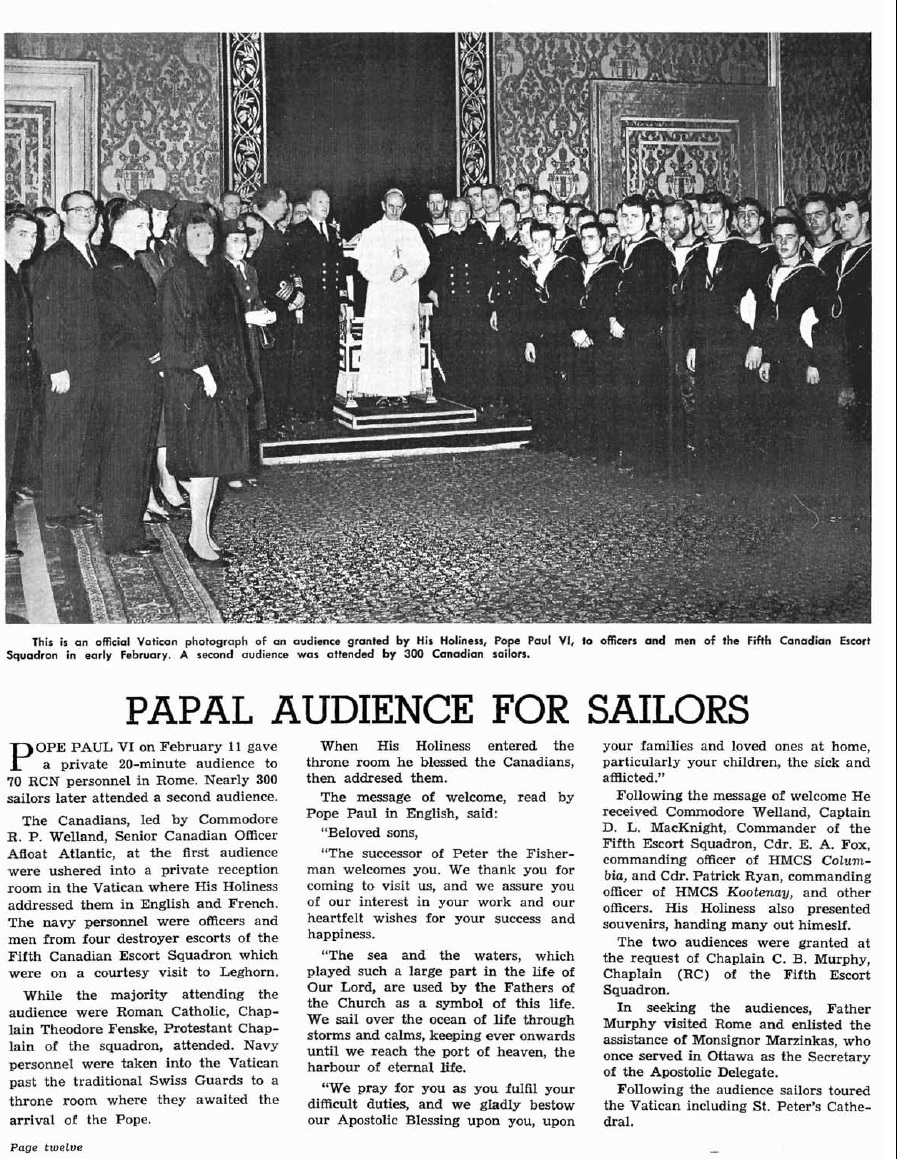 (ML01) Officers and men of the 5th Escort Squadron have an audience with Pope Paul VI - 11 Feb 1964 (ML02) Newspaper article from the Crow's Nest magazine on the audience with Pope Paul VI. (ML03) Sailors in what appears to be the admin office - ship unknown. Moe Lalonde 2nd from left. (ML04-ML05) Records of drafts for CPO2 Maurice Lalonde