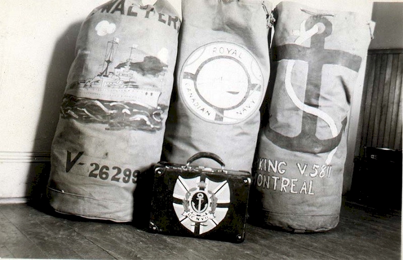 (1) Motor Mechanic King (2) Statement of Service (3) Three painted duffle bags - Rowland's duffel bag on the right. Duffel bag on the left belonged to Walters, V26299, RCNVR