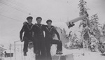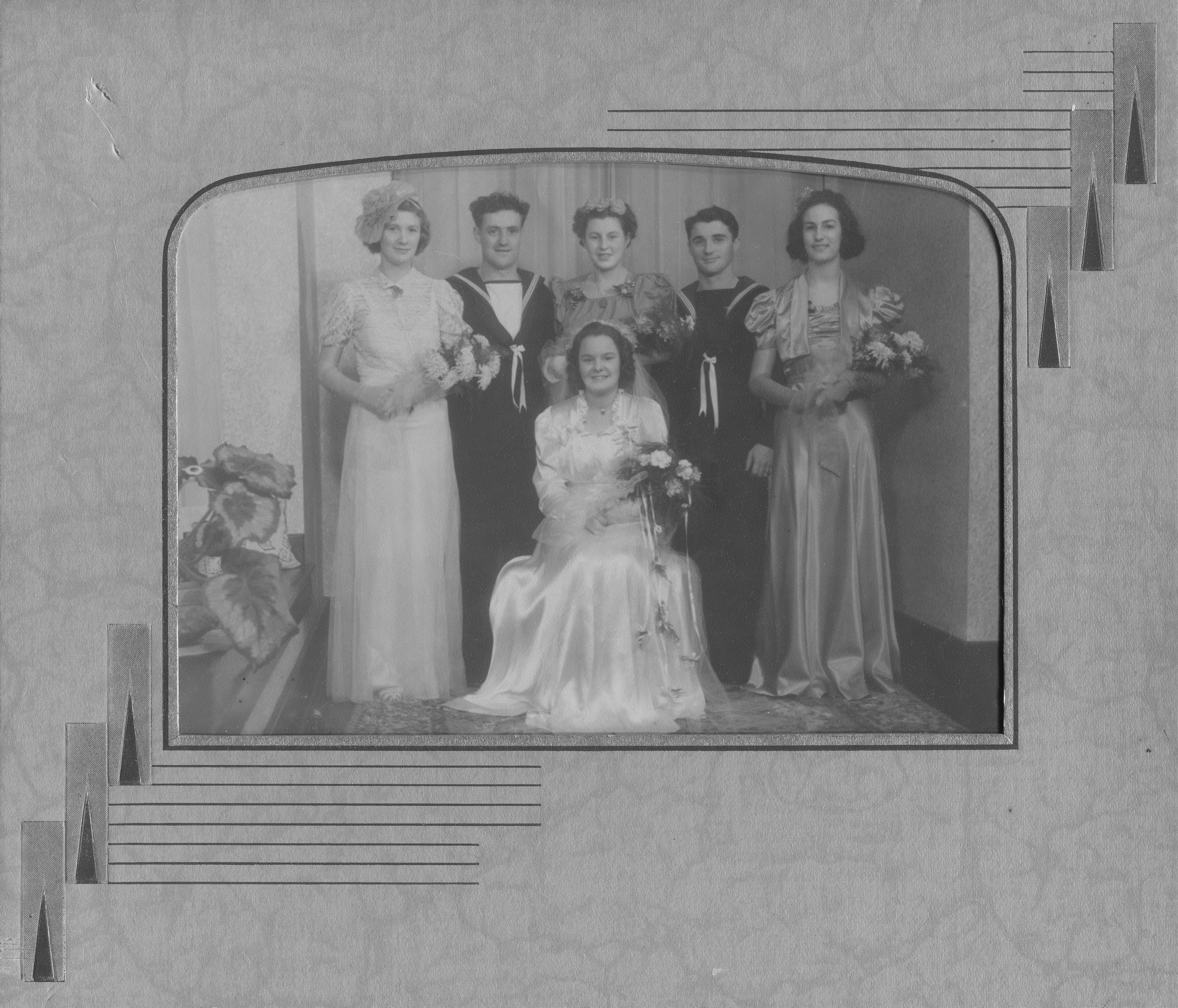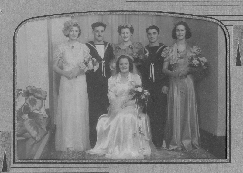 Standing, L-R: Mrs. W. Wood (matron of honour), William (Bill) Gagnon (groom), Miss Gwen Bennallack (bridesmaid), Edward McIldoon (best man) Miss Cedulia Gagnon (bridesmaid). Beatrice (née Bennallack) Gagnon, front, sitting