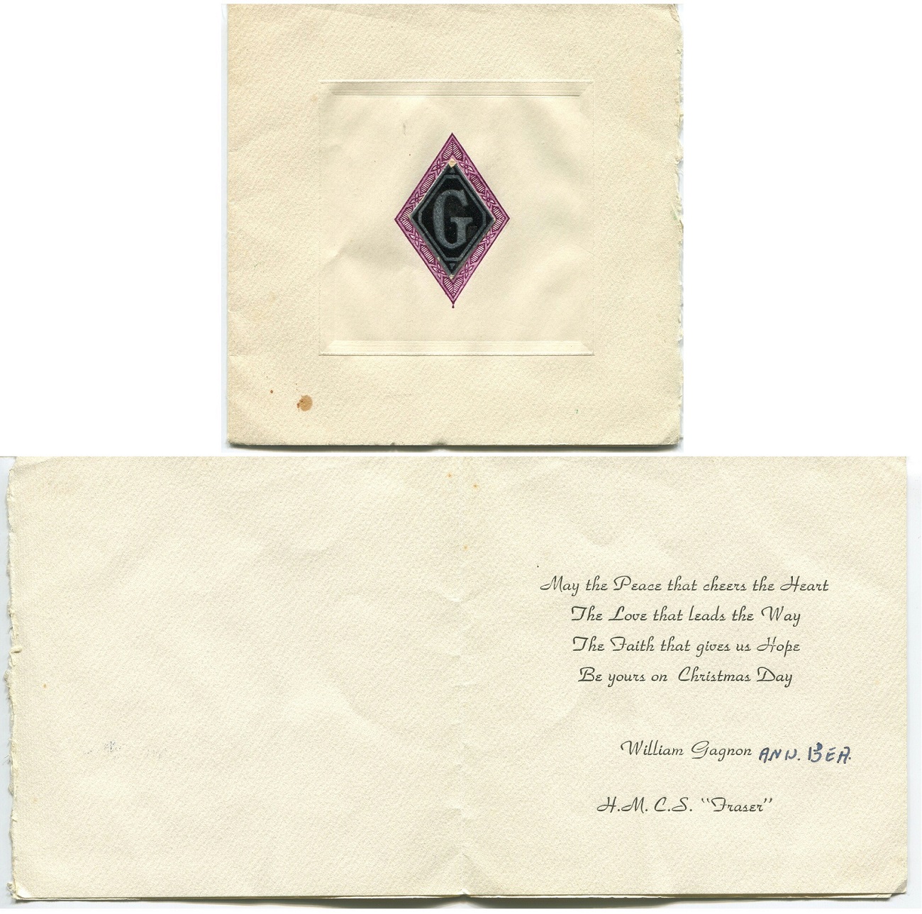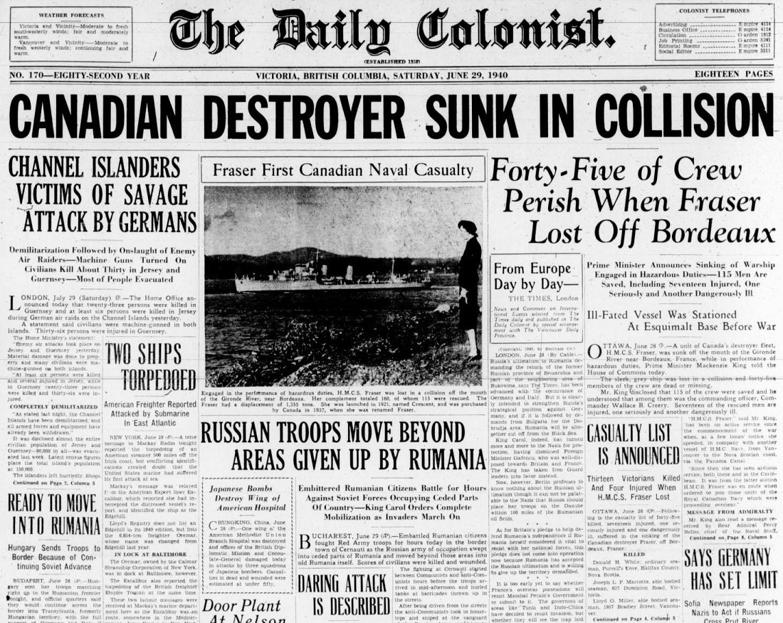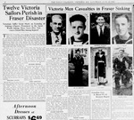 (WG08) HMCS Fraser envelope mailed from Kingston Jamaica 17 Feb 1939 (WG09) HMCS Fraser Christmas card (WG10-WG11) Articles on the Loss of HMCS FRASER - The Daily Colonist 29 Jun 1940