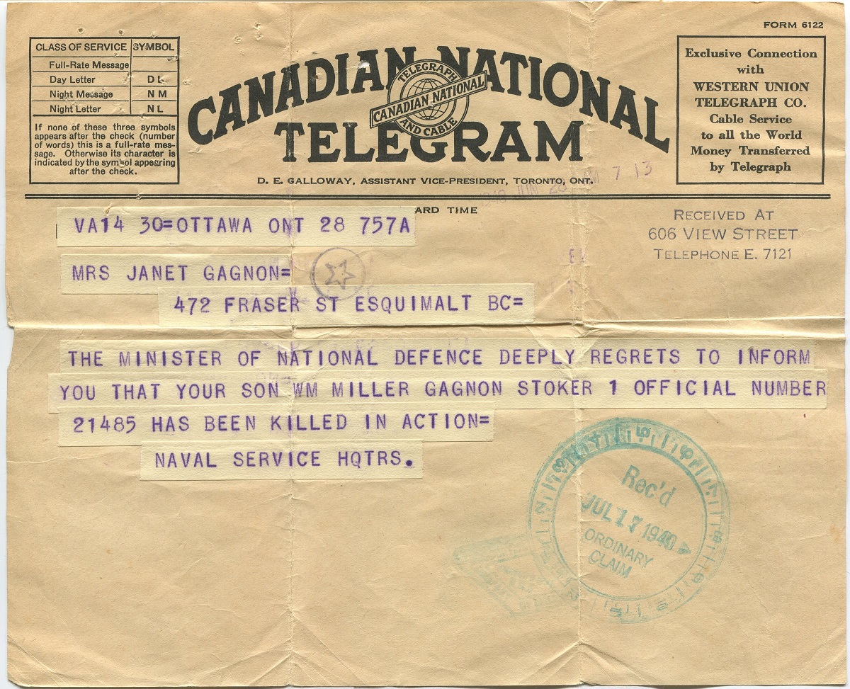 (WG01) Telegram to the mother of Stoker Gagnon informing her of the death of her son (WG02) Service File for William Gagnon // Source: The Library and Archives of Canada